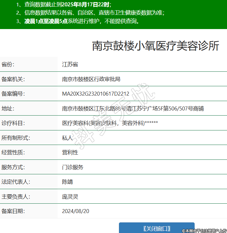 省份:江蘇省備案機(jī)關(guān):南京市鼓樓區(qū)行政審批局備案編號(hào):MA20X32G232010617D2212地址:南京市鼓樓區(qū)江東北路88號(hào)清江蘇寧廣場(chǎng)5F第506/507號(hào)商鋪診療科目:醫(yī)療美容科(美容皮膚科,美容外科)******所有制形式:私人經(jīng)營(yíng)性質(zhì):營(yíng)利性服務(wù)方式:門診服務(wù)法定代表人:陳靖主要負(fù)責(zé)人:龐靈靈備案日期:2024/08/20 -