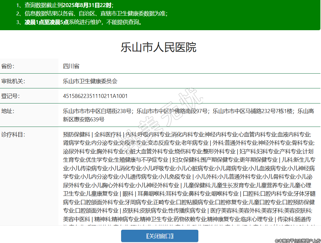 省份:四川省審批機(jī)關(guān):樂(lè)山市衛(wèi)生健康委員會(huì)登記號(hào):45158622351110211A1001地址:樂(lè)山市市市中區(qū)白塔街238號(hào);樂(lè)山市市中區(qū)護(hù)佛路南段97號(hào);樂(lè)山市市中區(qū)馬鋪路232號(hào)7棟1樓;樂(lè)山高新區(qū)惠安路639號(hào)診療科目:預(yù)防保健科 | 全科醫(yī)療科 | 內(nèi)科;呼吸內(nèi)科專業(yè);消化內(nèi)科專業(yè);神經(jīng)內(nèi)科專業(yè);心血管內(nèi)科專業(yè);血液內(nèi)科專業(yè);腎病學(xué)專業(yè);內(nèi)分泌專業(yè);免疫學(xué)專業(yè);變態(tài)反應(yīng)專業(yè);老年病專業(yè) | 外科;普通外科專業(yè);神經(jīng)外科專業(yè);骨科專業(yè);泌尿外科專業(yè);胸外科專業(yè);心臟大血管外科專業(yè);燒傷科專業(yè);整形外科專業(yè) | 婦產(chǎn)科;婦科專業(yè);產(chǎn)科專業(yè);計(jì)劃生育專業(yè);優(yōu)生學(xué)專業(yè);生殖健康與不孕癥專業(yè) | 婦女保健科;圍產(chǎn)期保健專業(yè);更年期保健專業(yè) | 兒科;新生兒專業(yè);小兒傳染病專業(yè);小兒消化專業(yè);小兒呼吸專業(yè);小兒心臟病專業(yè);小兒腎病專業(yè);小兒血液病專業(yè);小兒神經(jīng)病學(xué)專業(yè);小兒內(nèi)分泌專業(yè);小兒遺傳病專業(yè);小兒免疫專業(yè) | 小兒外科;小兒普通外科專業(yè);小兒骨科專業(yè);小兒泌尿外科專業(yè);小兒胸心外科專業(yè);小兒神經(jīng)外科專業(yè) | 兒童保健科;兒童生長(zhǎng)發(fā)育專業(yè);兒童營(yíng)養(yǎng)專業(yè);兒童心理衛(wèi)生專業(yè);兒童康復(fù)專業(yè) | 眼科 | 耳鼻咽喉科;耳科專業(yè);鼻科專業(yè);咽喉科專業(yè) | 口腔科;口腔內(nèi)科專業(yè);牙體牙髓病專業(yè);口腔頜面外科專業(yè);牙周病專業(yè);正畸專業(yè);口腔粘膜病專業(yè);口腔修復(fù)專業(yè);兒童口腔專業(yè);口腔預(yù)防保健專業(yè);口腔頜面外科專業(yè) | 皮膚科;皮膚病專業(yè);性傳播疾病專業(yè) | 醫(yī)療美容科;美容外科;美容牙科;美容皮膚科;美容中醫(yī)科 | 精神科;精神病專業(yè);精神衛(wèi)生專業(yè);藥物依賴專業(yè);精神康復(fù)專業(yè);臨床心理專業(yè) | 傳染科;腸道傳染病專業(yè);呼吸道傳染病專業(yè);肝炎專業(yè);蟲(chóng)媒傳染病專業(yè);動(dòng)物源性傳染病專業(yè);蠕蟲(chóng)病專業(yè) | 結(jié)核病科 | 腫瘤科 | 急診醫(yī)學(xué)科 | 康復(fù)醫(yī)學(xué)科 | 麻醉科 | 疼痛科 | 重癥醫(yī)學(xué)科 | 醫(yī)學(xué)檢驗(yàn)科;臨床體液、血液專業(yè);臨床微生物學(xué)專業(yè);臨床化學(xué)檢驗(yàn)專業(yè);臨床免疫、血清學(xué)專業(yè);臨床細(xì)胞分子遺傳學(xué)專業(yè) | 病理科 | 醫(yī)學(xué)影像科;X線診斷專業(yè);CT診斷專業(yè);磁共振成像診斷專業(yè);核醫(yī)學(xué)專業(yè);超聲診斷專業(yè);心電診斷專業(yè);腦電及腦血流圖診斷專業(yè);神經(jīng)肌肉電圖專業(yè);介入放射學(xué)專業(yè);放射治療專業(yè) | 中醫(yī)科;內(nèi)科專業(yè);外科專業(yè);婦產(chǎn)科專業(yè);兒科專業(yè);皮膚科專業(yè);眼科專業(yè);耳鼻咽喉科專業(yè);骨傷科專業(yè);肛腸科專業(yè);老年病科專業(yè);針灸科專業(yè);推拿科專業(yè);康復(fù)醫(yī)學(xué)專業(yè);預(yù)防保健科專業(yè) | 中西醫(yī)結(jié)合科******級(jí)別:三級(jí)法定代表人:曾國(guó)軍主要負(fù)責(zé)人:曾國(guó)軍執(zhí)業(yè)許可證有效期:2025/06/25 -至- 2040/02/27 -