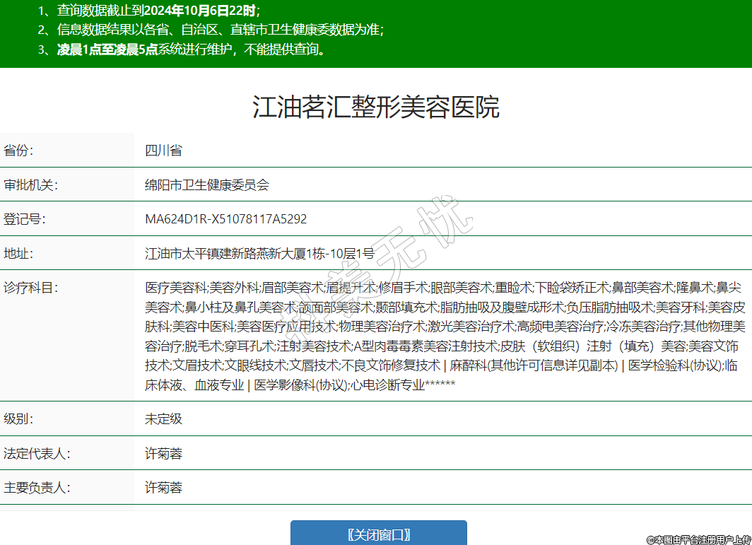 醫(yī)療美容科;美容外科;眉部美容術(shù);眉提升術(shù);修眉手術(shù);眼部美容術(shù);重瞼術(shù);下瞼袋矯正術(shù);鼻部美容術(shù);隆鼻術(shù);鼻尖美容術(shù);鼻小柱及鼻孔美容術(shù);頜面部美容術(shù);顳部填充術(shù);脂肪抽吸及腹壁成形術(shù);負(fù)壓脂肪抽吸術(shù);美容牙科;美容皮膚科;美容中醫(yī)科;美容醫(yī)療應(yīng)用技術(shù);物理美容治療術(shù);激光美容治療術(shù);高頻電美容治療;冷凍美容治療;其他物理美容治療;脫毛術(shù);穿耳孔術(shù);注射美容技術(shù);A型肉毒毒素美容注射技術(shù);皮膚(軟組織)注射(填充)美容;美容文飾技術(shù);文眉技術(shù);文眼線技術(shù);文唇技術(shù);不良文飾修復(fù)技術(shù) | 麻醉科(其他許可信息詳見(jiàn)副本) | 醫(yī)學(xué)檢驗(yàn)科(協(xié)議);臨床體液、血液專業(yè) | 醫(yī)學(xué)影像科(協(xié)議);心電診斷專業(yè)******