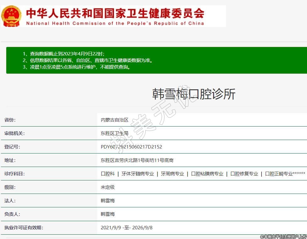 鄂爾多斯韓雪梅口腔診療科目:口腔科 | 牙體牙髓病專業(yè) | 牙周病專業(yè) | 口腔粘膜病專業(yè) | 口腔修復專業(yè) | 口腔正畸專業(yè)******