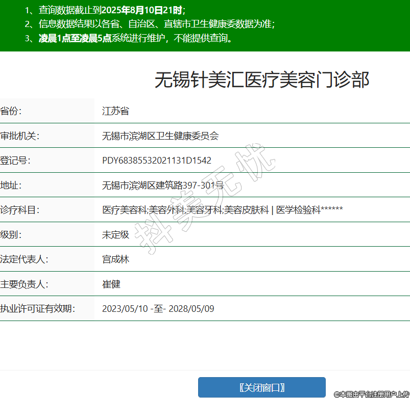 省份:江蘇省審批機關(guān):無錫市濱湖區(qū)衛(wèi)生健康委員會登記號:PDY68385532021131D1542地址:無錫市濱湖區(qū)建筑路397-301號診療科目:醫(yī)療美容科;美容外科;美容牙科;美容皮膚科 | 醫(yī)學檢驗科******級別:未定級法定代表人:宮成林主要負責人:崔健執(zhí)業(yè)許可證有效期:2023/05/10 -至- 2028/05/09 -