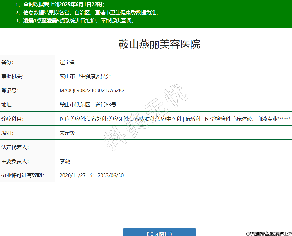 省份:遼寧省審批機(jī)關(guān):鞍山市衛(wèi)生健康委員會(huì)登記號:MA0QE90R221030217A5282地址:鞍山市鐵東區(qū)二道街63號診療科目:醫(yī)療美容科;美容外科;美容牙科;美容皮膚科;美容中醫(yī)科 | 麻醉科 | 醫(yī)學(xué)檢驗(yàn)科;臨床體液、血液專業(yè)******級別:未定級法定代表人:主要負(fù)責(zé)人:李燕執(zhí)業(yè)許可證有效期:2020/11/27 -至- 2033/06/30 -
