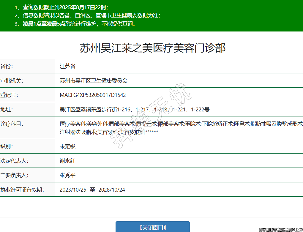 省份:江蘇省審批機(jī)關(guān):蘇州市吳江區(qū)衛(wèi)生健康委員會(huì)登記號(hào):MACFG4XP532050917D1542地址:吳江區(qū)盛澤鎮(zhèn)東盛步行街1-216,1-217,1-218,1-221,1-222號(hào)診療科目:醫(yī)療美容科;美容外科;眉部美容術(shù);眉提升術(shù);眼部美容術(shù);重瞼術(shù);下瞼袋矯正術(shù);隆鼻術(shù);脂肪抽吸及腹壁成形術(shù);注射器法吸脂術(shù);美容牙科;美容皮膚科******級(jí)別:未定級(jí)法定代表人:謝永紅主要負(fù)責(zé)人:張秀平執(zhí)業(yè)許可證有效期:2023/10/25 -至- 2028/10/24 -
