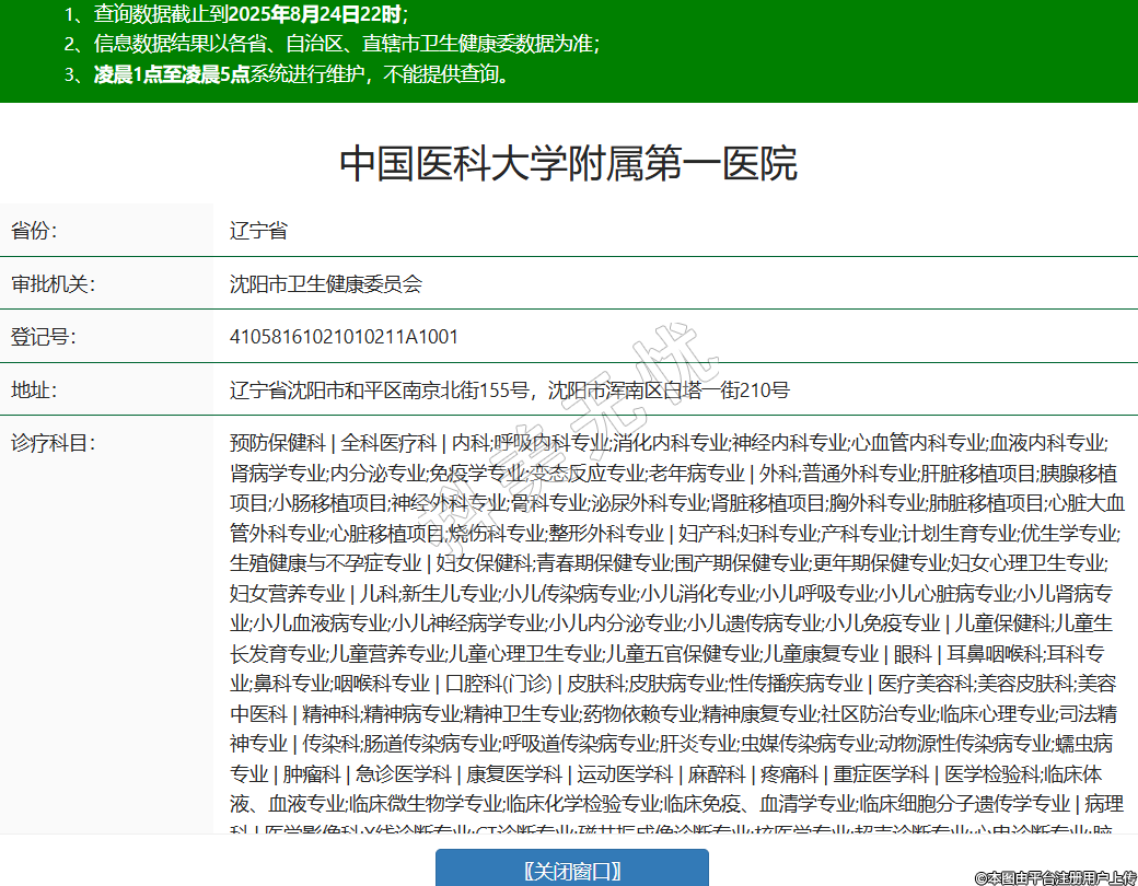 省份:遼寧省審批機關(guān):沈陽市衛(wèi)生健康委員會登記號:41058161021010211A1001地址:遼寧省沈陽市和平區(qū)南京北街155號,沈陽市渾南區(qū)白塔一街210號診療科目:預防保健科 | 全科醫(yī)療科 | 內(nèi)科;呼吸內(nèi)科專業(yè);消化內(nèi)科專業(yè);神經(jīng)內(nèi)科專業(yè);心血管內(nèi)科專業(yè);血液內(nèi)科專業(yè);腎病學專業(yè);內(nèi)分泌專業(yè);免疫學專業(yè);變態(tài)反應專業(yè);老年病專業(yè) | 外科;普通外科專業(yè);肝臟移植項目;胰腺移植項目;小腸移植項目;神經(jīng)外科專業(yè);骨科專業(yè);泌尿外科專業(yè);腎臟移植項目;胸外科專業(yè);肺臟移植項目;心臟大血管外科專業(yè);心臟移植項目;燒傷科專業(yè);整形外科專業(yè) | 婦產(chǎn)科;婦科專業(yè);產(chǎn)科專業(yè);計劃生育專業(yè);優(yōu)生學專業(yè);生殖健康與不孕癥專業(yè) | 婦女保健科;青春期保健專業(yè);圍產(chǎn)期保健專業(yè);更年期保健專業(yè);婦女心理衛(wèi)生專業(yè);婦女營養(yǎng)專業(yè) | 兒科;新生兒專業(yè);小兒傳染病專業(yè);小兒消化專業(yè);小兒呼吸專業(yè);小兒心臟病專業(yè);小兒腎病專業(yè);小兒血液病專業(yè);小兒神經(jīng)病學專業(yè);小兒內(nèi)分泌專業(yè);小兒遺傳病專業(yè);小兒免疫專業(yè) | 兒童保健科;兒童生長發(fā)育專業(yè);兒童營養(yǎng)專業(yè);兒童心理衛(wèi)生專業(yè);兒童五官保健專業(yè);兒童康復專業(yè) | 眼科 | 耳鼻咽喉科;耳科專業(yè);鼻科專業(yè);咽喉科專業(yè) | 口腔科(門診) | 皮膚科;皮膚病專業(yè);性傳播疾病專業(yè) | 醫(yī)療美容科;美容皮膚科;美容中醫(yī)科 | 精神科;精神病專業(yè);精神衛(wèi)生專業(yè);藥物依賴專業(yè);精神康復專業(yè);社區(qū)防治專業(yè);臨床心理專業(yè);司法精神專業(yè) | 傳染科;腸道傳染病專業(yè);呼吸道傳染病專業(yè);肝炎專業(yè);蟲媒傳染病專業(yè);動物源性傳染病專業(yè);蠕蟲病專業(yè) | 腫瘤科 | 急診醫(yī)學科 | 康復醫(yī)學科 | 運動醫(yī)學科 | 麻醉科 | 疼痛科 | 重癥醫(yī)學科 | 醫(yī)學檢驗科;臨床體液、血液專業(yè);臨床微生物學專業(yè);臨床化學檢驗專業(yè);臨床免疫、血清學專業(yè);臨床細胞分子遺傳學專業(yè) | 病理科 | 醫(yī)學影像科;X線診斷專業(yè);CT診斷專業(yè);磁共振成像診斷專業(yè);核醫(yī)學專業(yè);超聲診斷專業(yè);心電診斷專業(yè);腦電及腦血流圖診斷專業(yè);神經(jīng)肌肉電圖專業(yè);介入放射學專業(yè);放射治療專業(yè) | 中醫(yī)科;內(nèi)科專業(yè);外科專業(yè);婦產(chǎn)科專業(yè);兒科專業(yè);皮膚科專業(yè);眼科專業(yè);耳鼻咽喉科專業(yè);腫瘤科專業(yè);骨傷科專業(yè);肛腸科專業(yè);老年病科專業(yè);針灸科專業(yè);推拿科專業(yè);康復醫(yī)學專業(yè);急診科專業(yè);預防保健科專業(yè) | 中西醫(yī)結(jié)合科******級別:三級法定代表人:尚紅主要負責人:尚紅執(zhí)業(yè)許可證有效期:2020/11/30 -至- 2033/02/01 -