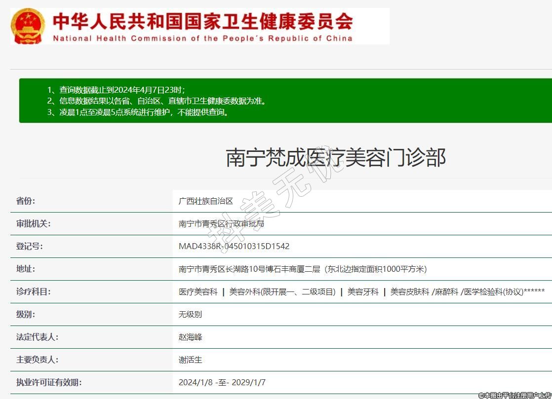 南寧梵成醫(yī)療美容門診部,診療科目:醫(yī)療美容科 | 美容外科(限開展一、二級項目) | 美容牙科 | 美容皮膚科 /麻醉科 /醫(yī)學檢驗科(協(xié)議)******