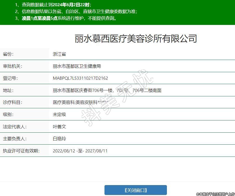 麗水慕西醫(yī)療美容診所有限公司,診療科目:醫(yī)療美容科;美容皮膚科******