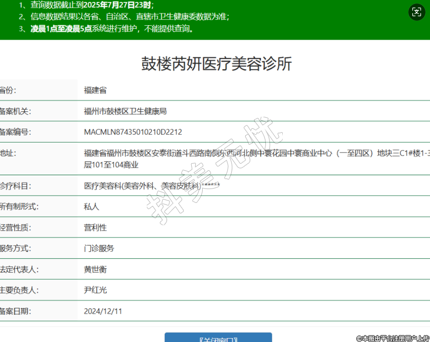 省份:福建省備案機(jī)關(guān):福州市鼓樓區(qū)衛(wèi)生健康局備案編號:MACMLN87435010210D2212地址:福建省福州市鼓樓區(qū)安泰街道斗西路南側(cè)東西河北側(cè)中寰花園中寰商業(yè)中心(一至四區(qū))地塊三C1#樓1-3層101至104商業(yè)診療科目:醫(yī)療美容科(美容外科、美容皮膚科)******所有制形式:私人經(jīng)營性質(zhì):營利性服務(wù)方式:門診服務(wù)法定代表人:黃世衡主要負(fù)責(zé)人:尹紅光備案日期:2024/12/11 -