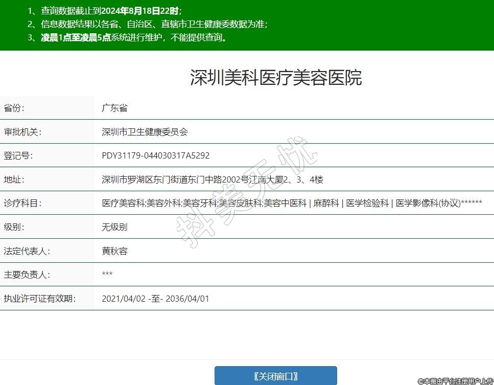 深圳美科醫(yī)療美容醫(yī)院,診療科目:醫(yī)療美容科;美容外科;美容牙科;美容皮膚科;美容中醫(yī)科 | 麻醉科 | 醫(yī)學檢驗科 | 醫(yī)學影像科(協(xié)議)******
