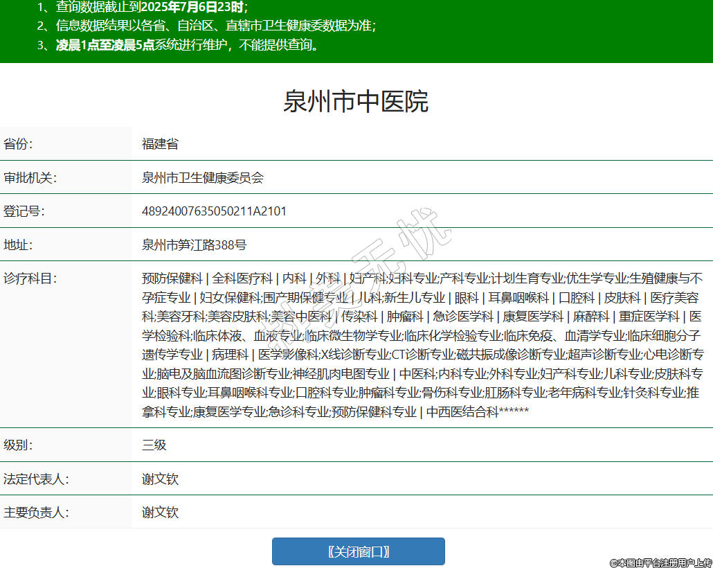 省份:福建省審批機關:泉州市衛(wèi)生健康委員會登記號:48924007635050211A2101地址:泉州市筍江路388號診療科目:預防保健科 | 全科醫(yī)療科 | 內科 | 外科 | 婦產科;婦科專業(yè);產科專業(yè);計劃生育專業(yè);優(yōu)生學專業(yè);生殖健康與不孕癥專業(yè) | 婦女保健科;圍產期保健專業(yè) | 兒科;新生兒專業(yè) | 眼科 | 耳鼻咽喉科 | 口腔科 | 皮膚科 | 醫(yī)療美容科;美容牙科;美容皮膚科;美容中醫(yī)科 | 傳染科 | 腫瘤科 | 急診醫(yī)學科 | 康復醫(yī)學科 | 麻醉科 | 重癥醫(yī)學科 | 醫(yī)學檢驗科;臨床體液、血液專業(yè);臨床微生物學專業(yè);臨床化學檢驗專業(yè);臨床免疫、血清學專業(yè);臨床細胞分子遺傳學專業(yè) | 病理科 | 醫(yī)學影像科;X線診斷專業(yè);CT診斷專業(yè);磁共振成像診斷專業(yè);超聲診斷專業(yè);心電診斷專業(yè);腦電及腦血流圖診斷專業(yè);神經肌肉電圖專業(yè) | 中醫(yī)科;內科專業(yè);外科專業(yè);婦產科專業(yè);兒科專業(yè);皮膚科專業(yè);眼科專業(yè);耳鼻咽喉科專業(yè);口腔科專業(yè);腫瘤科專業(yè);骨傷科專業(yè);肛腸科專業(yè);老年病科專業(yè);針灸科專業(yè);推拿科專業(yè);康復醫(yī)學專業(yè);急診科專業(yè);預防保健科專業(yè) | 中西醫(yī)結合科******級別:三級法定代表人:謝文欽主要負責人:謝文欽執(zhí)業(yè)許可證有效期:2022/07/22 -至- 2028/07/21 -