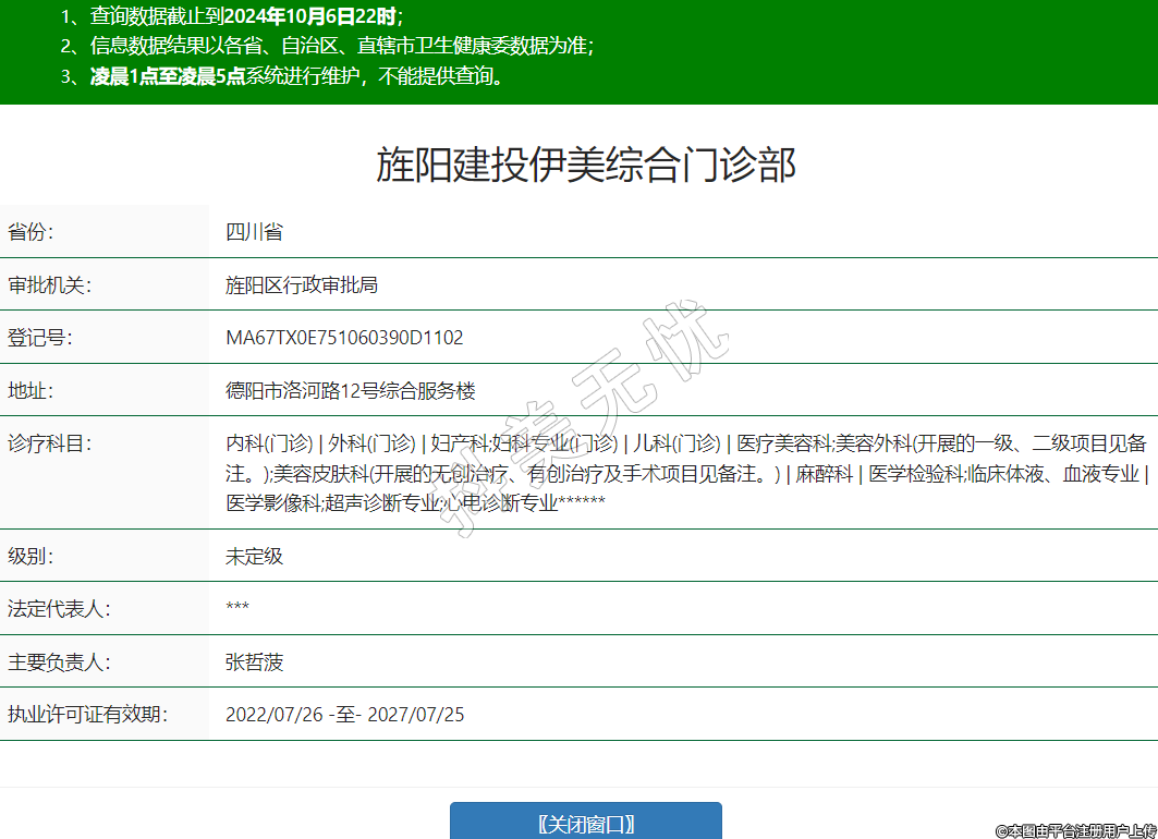 內(nèi)科(門診) | 外科(門診) | 婦產(chǎn)科;婦科專業(yè)(門診) | 兒科(門診) | 醫(yī)療美容科;美容外科(開展的一級、二級項目見備注。);美容皮膚科(開展的無創(chuàng)治療、有創(chuàng)治療及手術(shù)項目見備注。) | 麻醉科 | 醫(yī)學檢驗科;臨床體液、血液專業(yè) | 醫(yī)學影像科;超聲診斷專業(yè);心電診斷專業(yè)******