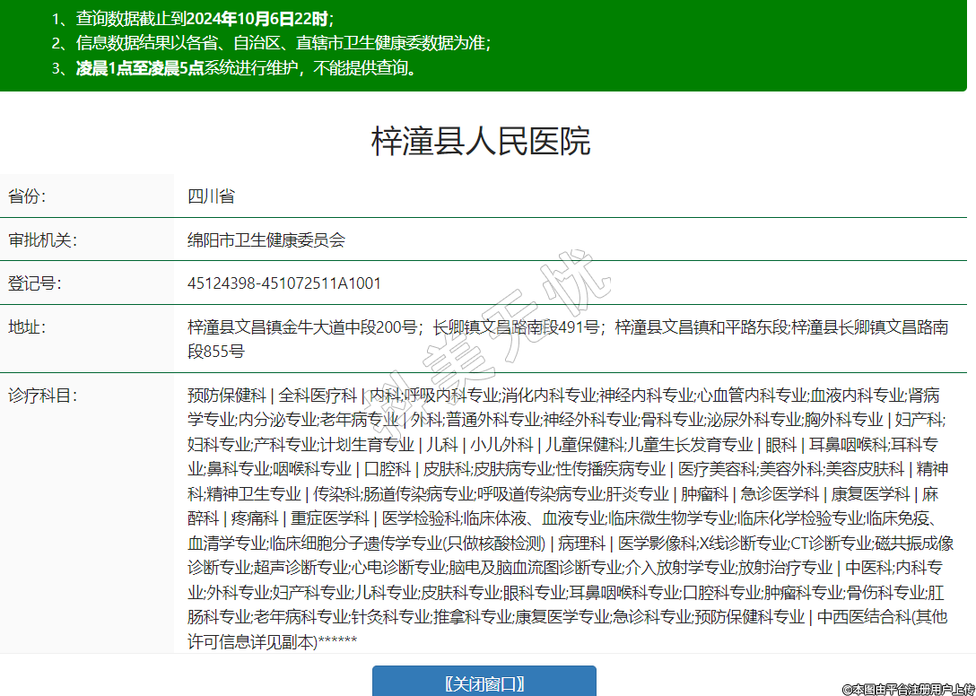 預(yù)防保健科 | 全科醫(yī)療科 | 內(nèi)科;呼吸內(nèi)科專業(yè);消化內(nèi)科專業(yè);神經(jīng)內(nèi)科專業(yè);心血管內(nèi)科專業(yè);血液內(nèi)科專業(yè);腎病學(xué)專業(yè);內(nèi)分泌專業(yè);老年病專業(yè) | 外科;普通外科專業(yè);神經(jīng)外科專業(yè);骨科專業(yè);泌尿外科專業(yè);胸外科專業(yè) | 婦產(chǎn)科;婦科專業(yè);產(chǎn)科專業(yè);計劃生育專業(yè) | 兒科 | 小兒外科 | 兒童保健科;兒童生長發(fā)育專業(yè) | 眼科 | 耳鼻咽喉科;耳科專業(yè);鼻科專業(yè);咽喉科專業(yè) | 口腔科 | 皮膚科;皮膚病專業(yè);性傳播疾病專業(yè) | 醫(yī)療美容科;美容外科;美容皮膚科 | 精神科;精神衛(wèi)生專業(yè) | 傳染科;腸道傳染病專業(yè);呼吸道傳染病專業(yè);肝炎專業(yè) | 腫瘤科 | 急診醫(yī)學(xué)科 | 康復(fù)醫(yī)學(xué)科 | 麻醉科 | 疼痛科 | 重癥醫(yī)學(xué)科 | 醫(yī)學(xué)檢驗科;臨床體液、血液專業(yè);臨床微生物學(xué)專業(yè);臨床化學(xué)檢驗專業(yè);臨床免疫、血清學(xué)專業(yè);臨床細(xì)胞分子遺傳學(xué)專業(yè)(只做核酸檢測) | 病理科 | 醫(yī)學(xué)影像科;X線診斷專業(yè);CT診斷專業(yè);磁共振成像診斷專業(yè);超聲診斷專業(yè);心電診斷專業(yè);腦電及腦血流圖診斷專業(yè);介入放射學(xué)專業(yè);放射治療專業(yè) | 中醫(yī)科;內(nèi)科專業(yè);外科專業(yè);婦產(chǎn)科專業(yè);兒科專業(yè);皮膚科專業(yè);眼科專業(yè);耳鼻咽喉科專業(yè);口腔科專業(yè);腫瘤科專業(yè);骨傷科專業(yè);肛腸科專業(yè);老年病科專業(yè);針灸科專業(yè);推拿科專業(yè);康復(fù)醫(yī)學(xué)專業(yè);急診科專業(yè);預(yù)防保健科專業(yè) | 中西醫(yī)結(jié)合科(其他許可信息詳見副本)******