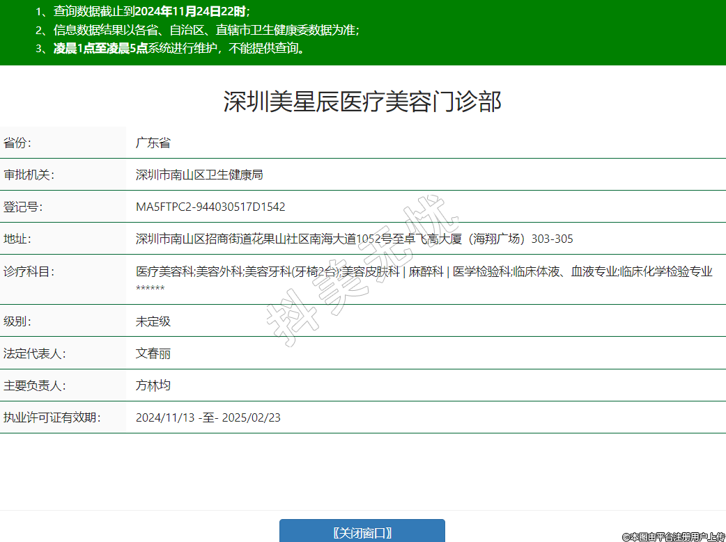 深圳美星辰醫(yī)療美容門診部,診療科目:醫(yī)療美容科;美容外科;美容牙科(牙椅2臺);美容皮膚科 | 麻醉科 | 醫(yī)學檢驗科;臨床體液、血液專業(yè);臨床化學檢驗專業(yè)******