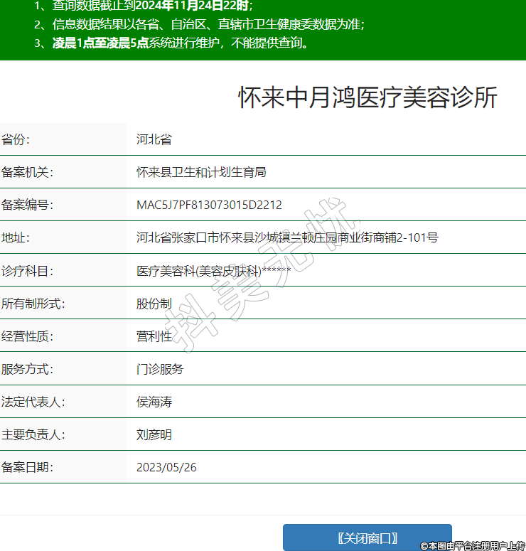 懷來中月鴻醫(yī)療美容診所,診療科目:醫(yī)療美容科(美容皮膚科)******