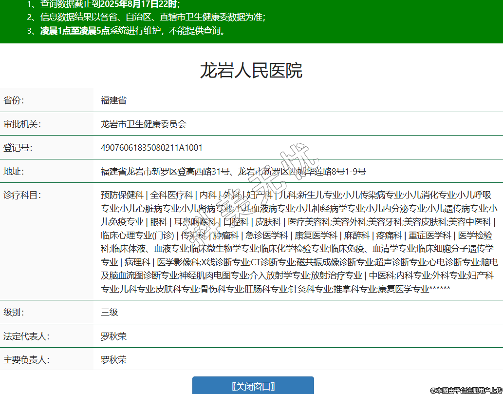 省份:福建省審批機(jī)關(guān):龍巖市衛(wèi)生健康委員會(huì)登記號(hào):49076061835080211A1001地址:福建省龍巖市新羅區(qū)登高西路31號(hào)、龍巖市新羅區(qū)西城華蓮路8號(hào)1-9號(hào)診療科目:預(yù)防保健科 | 全科醫(yī)療科 | 內(nèi)科 | 外科 | 婦產(chǎn)科 | 兒科;新生兒專業(yè);小兒傳染病專業(yè);小兒消化專業(yè);小兒呼吸專業(yè);小兒心臟病專業(yè);小兒腎病專業(yè);小兒血液病專業(yè);小兒神經(jīng)病學(xué)專業(yè);小兒內(nèi)分泌專業(yè);小兒遺傳病專業(yè);小兒免疫專業(yè) | 眼科 | 耳鼻咽喉科 | 口腔科 | 皮膚科 | 醫(yī)療美容科;美容外科;美容牙科;美容皮膚科;美容中醫(yī)科 | 臨床心理專業(yè)(門(mén)診) | 傳染科 | 腫瘤科 | 急診醫(yī)學(xué)科 | 康復(fù)醫(yī)學(xué)科 | 麻醉科 | 疼痛科 | 重癥醫(yī)學(xué)科 | 醫(yī)學(xué)檢驗(yàn)科;臨床體液、血液專業(yè);臨床微生物學(xué)專業(yè);臨床化學(xué)檢驗(yàn)專業(yè);臨床免疫、血清學(xué)專業(yè);臨床細(xì)胞分子遺傳學(xué)專業(yè) | 病理科 | 醫(yī)學(xué)影像科;X線診斷專業(yè);CT診斷專業(yè);磁共振成像診斷專業(yè);超聲診斷專業(yè);心電診斷專業(yè);腦電及腦血流圖診斷專業(yè);神經(jīng)肌肉電圖專業(yè);介入放射學(xué)專業(yè);放射治療專業(yè) | 中醫(yī)科;內(nèi)科專業(yè);外科專業(yè);婦產(chǎn)科專業(yè);兒科專業(yè);皮膚科專業(yè);骨傷科專業(yè);肛腸科專業(yè);針灸科專業(yè);推拿科專業(yè);康復(fù)醫(yī)學(xué)專業(yè)******級(jí)別:三級(jí)法定代表人:羅秋榮主要負(fù)責(zé)人:羅秋榮執(zhí)業(yè)許可證有效期:2025/05/28 -至- 2031/05/27 -