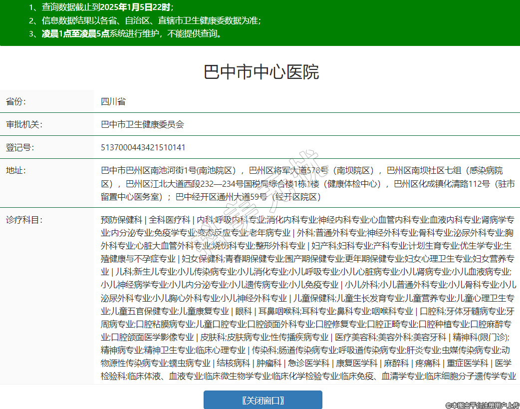 巴中市巴州區(qū)南池河街1號(南池院區(qū)),巴州區(qū)將軍大道578號(南壩院區(qū)),巴州區(qū)南壩社區(qū)七組(感染病院區(qū)),巴州區(qū)江北大道西段232—234號國稅局綜合樓1棟1樓(健康體檢中心),巴州區(qū)化成鎮(zhèn)化清路112號(駐市留置中心醫(yī)務室);巴中經開區(qū)通州大道59號(經開區(qū)院區(qū))