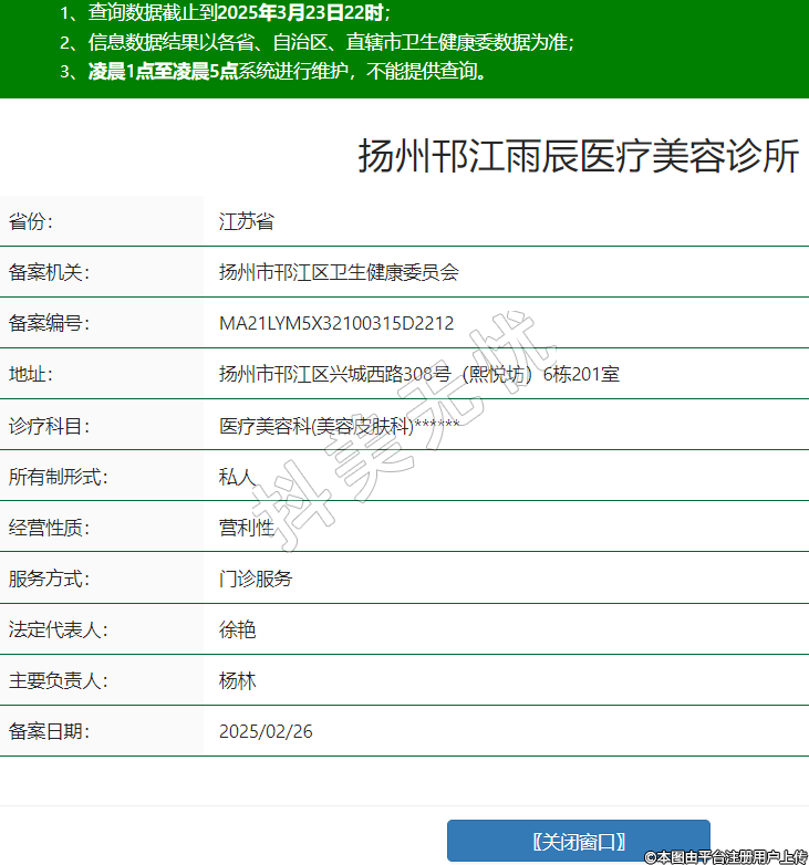 揚州邗江雨辰醫(yī)療美容診所,診療科目:醫(yī)療美容科(美容皮膚科)******
