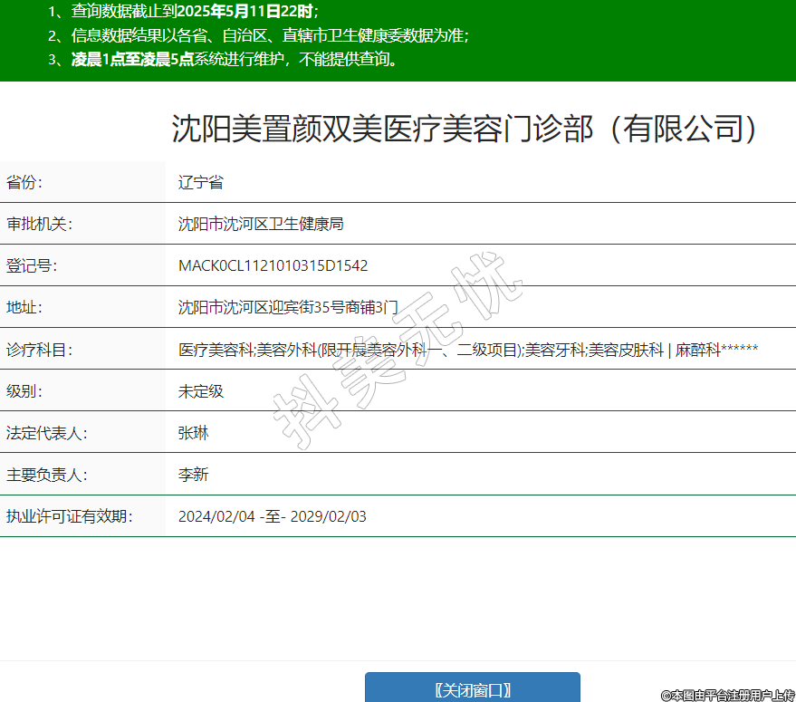 沈陽美置顏雙美醫(yī)療美容門診部(有限公司),診療科目:醫(yī)療美容科;美容外科(限開展美容外科一、二級(jí)項(xiàng)目);美容牙科;美容皮膚科 | 麻醉科******