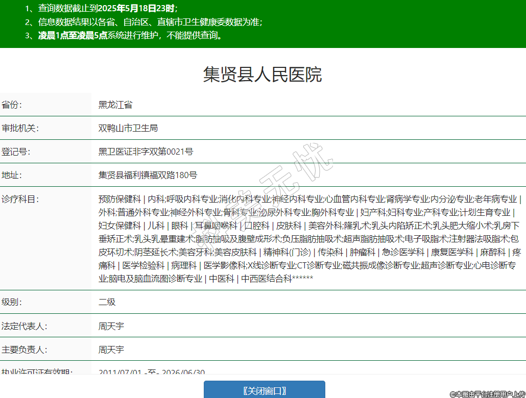 省份:黑龍江省審批機關(guān):雙鴨山市衛(wèi)生局登記號:黑衛(wèi)醫(yī)證非字雙第0021號地址:集賢縣福利鎮(zhèn)福雙路180號診療科目:預(yù)防保健科 | 內(nèi)科;呼吸內(nèi)科專業(yè);消化內(nèi)科專業(yè);神經(jīng)內(nèi)科專業(yè);心血管內(nèi)科專業(yè);腎病學(xué)專業(yè);內(nèi)分泌專業(yè);老年病專業(yè) | 外科;普通外科專業(yè);神經(jīng)外科專業(yè);骨科專業(yè);泌尿外科專業(yè);胸外科專業(yè) | 婦產(chǎn)科;婦科專業(yè);產(chǎn)科專業(yè);計劃生育專業(yè) | 婦女保健科 | 兒科 | 眼科 | 耳鼻咽喉科 | 口腔科 | 皮膚科 | 美容外科;隆乳術(shù);乳頭內(nèi)陷矯正術(shù);乳頭肥大縮小術(shù);乳房下垂矯正術(shù);乳頭乳暈重建術(shù);脂肪抽吸及腹壁成形術(shù);負壓脂肪抽吸術(shù);超聲脂肪抽吸術(shù);電子吸脂術(shù);注射器法吸脂術(shù);包皮環(huán)切術(shù);陰莖延長術(shù);美容牙科;美容皮膚科 | 精神科(門診) | 傳染科 | 腫瘤科 | 急診醫(yī)學(xué)科 | 康復(fù)醫(yī)學(xué)科 | 麻醉科 | 疼痛科 | 醫(yī)學(xué)檢驗科 | 病理科 | 醫(yī)學(xué)影像科;X線診斷專業(yè);CT診斷專業(yè);磁共振成像診斷專業(yè);超聲診斷專業(yè);心電診斷專業(yè);腦電及腦血流圖診斷專業(yè) | 中醫(yī)科 | 中西醫(yī)結(jié)合科******級別:二級法定代表人:周天宇主要負責(zé)人:周天宇執(zhí)業(yè)許可證有效期:2011/07/01 -至- 2026/06/30 -