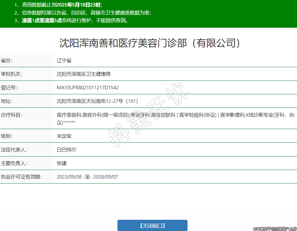 沈陽渾南善和醫(yī)療美容門診部(有限公司),診療科目:醫(yī)療美容科;美容外科(限一級(jí)項(xiàng)目);美容牙科;美容皮膚科 | 醫(yī)學(xué)檢驗(yàn)科(協(xié)議) | 醫(yī)學(xué)影像科;X線診斷專業(yè)(牙科,協(xié)議)******