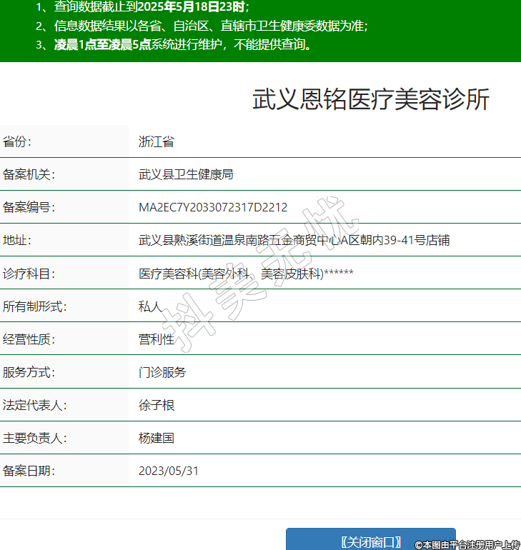 省份:浙江省備案機(jī)關(guān):武義縣衛(wèi)生健康局備案編號:MA2EC7Y2033072317D2212地址:武義縣熟溪街道溫泉南路五金商貿(mào)中心A區(qū)朝內(nèi)39-41號店鋪診療科目:醫(yī)療美容科(美容外科、美容皮膚科)******所有制形式:私人經(jīng)營性質(zhì):營利性服務(wù)方式:門診服務(wù)法定代表人:徐子根主要負(fù)責(zé)人:楊建國備案日期:2023/05/31 -