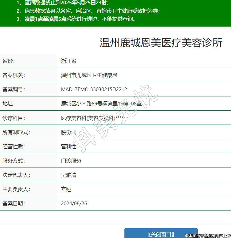 省份:浙江省備案機關(guān):溫州市鹿城區(qū)衛(wèi)生健康局備案編號:MADL7EM8133030215D2212地址:鹿城區(qū)小南路69號檀鏡里16幢108室診療科目:醫(yī)療美容科(美容皮膚科)******所有制形式:股份制經(jīng)營性質(zhì):營利性服務方式:門診服務法定代表人:吳雅清主要負責人:方婭備案日期:2024/08/26 -