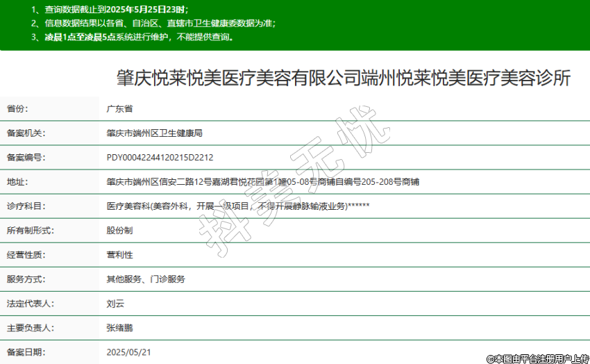 省份:廣東省備案機(jī)關(guān):肇慶市端州區(qū)衛(wèi)生健康局備案編號(hào):PDY00042244120215D2212地址:肇慶市端州區(qū)信安二路12號(hào)嘉湖君悅花園第1幢05-08號(hào)商鋪?zhàn)跃幪?hào)205-208號(hào)商鋪診療科目:醫(yī)療美容科(美容外科,開(kāi)展一級(jí)項(xiàng)目,不得開(kāi)展靜脈輸液業(yè)務(wù))******所有制形式:股份制經(jīng)營(yíng)性質(zhì):營(yíng)利性服務(wù)方式:其他服務(wù)、門診服務(wù)法定代表人:劉云主要負(fù)責(zé)人:張緒鵬備案日期:2025/05/21 -