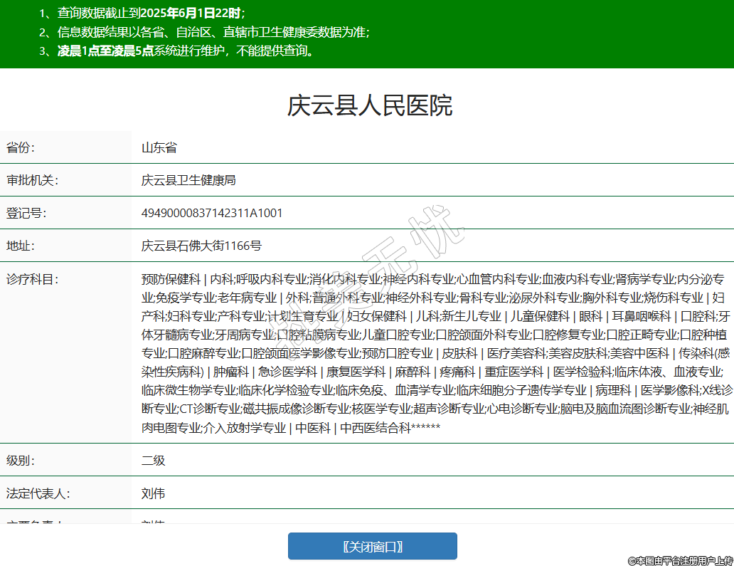省份:山東省審批機(jī)關(guān):慶云縣衛(wèi)生健康局登記號:49490000837142311A1001地址:慶云縣石佛大街1166號診療科目:預(yù)防保健科 | 內(nèi)科;呼吸內(nèi)科專業(yè);消化內(nèi)科專業(yè);神經(jīng)內(nèi)科專業(yè);心血管內(nèi)科專業(yè);血液內(nèi)科專業(yè);腎病學(xué)專業(yè);內(nèi)分泌專業(yè);免疫學(xué)專業(yè);老年病專業(yè) | 外科;普通外科專業(yè);神經(jīng)外科專業(yè);骨科專業(yè);泌尿外科專業(yè);胸外科專業(yè);燒傷科專業(yè) | 婦產(chǎn)科;婦科專業(yè);產(chǎn)科專業(yè);計(jì)劃生育專業(yè) | 婦女保健科 | 兒科;新生兒專業(yè) | 兒童保健科 | 眼科 | 耳鼻咽喉科 | 口腔科;牙體牙髓病專業(yè);牙周病專業(yè);口腔粘膜病專業(yè);兒童口腔專業(yè);口腔頜面外科專業(yè);口腔修復(fù)專業(yè);口腔正畸專業(yè);口腔種植專業(yè);口腔麻醉專業(yè);口腔頜面醫(yī)學(xué)影像專業(yè);預(yù)防口腔專業(yè) | 皮膚科 | 醫(yī)療美容科;美容皮膚科;美容中醫(yī)科 | 傳染科(感染性疾病科) | 腫瘤科 | 急診醫(yī)學(xué)科 | 康復(fù)醫(yī)學(xué)科 | 麻醉科 | 疼痛科 | 重癥醫(yī)學(xué)科 | 醫(yī)學(xué)檢驗(yàn)科;臨床體液、血液專業(yè);臨床微生物學(xué)專業(yè);臨床化學(xué)檢驗(yàn)專業(yè);臨床免疫、血清學(xué)專業(yè);臨床細(xì)胞分子遺傳學(xué)專業(yè) | 病理科 | 醫(yī)學(xué)影像科;X線診斷專業(yè);CT診斷專業(yè);磁共振成像診斷專業(yè);核醫(yī)學(xué)專業(yè);超聲診斷專業(yè);心電診斷專業(yè);腦電及腦血流圖診斷專業(yè);神經(jīng)肌肉電圖專業(yè);介入放射學(xué)專業(yè) | 中醫(yī)科 | 中西醫(yī)結(jié)合科******級別:二級法定代表人:劉偉主要負(fù)責(zé)人:劉偉執(zhí)業(yè)許可證有效期:2022/01/26 -至- 2037/01/25 -