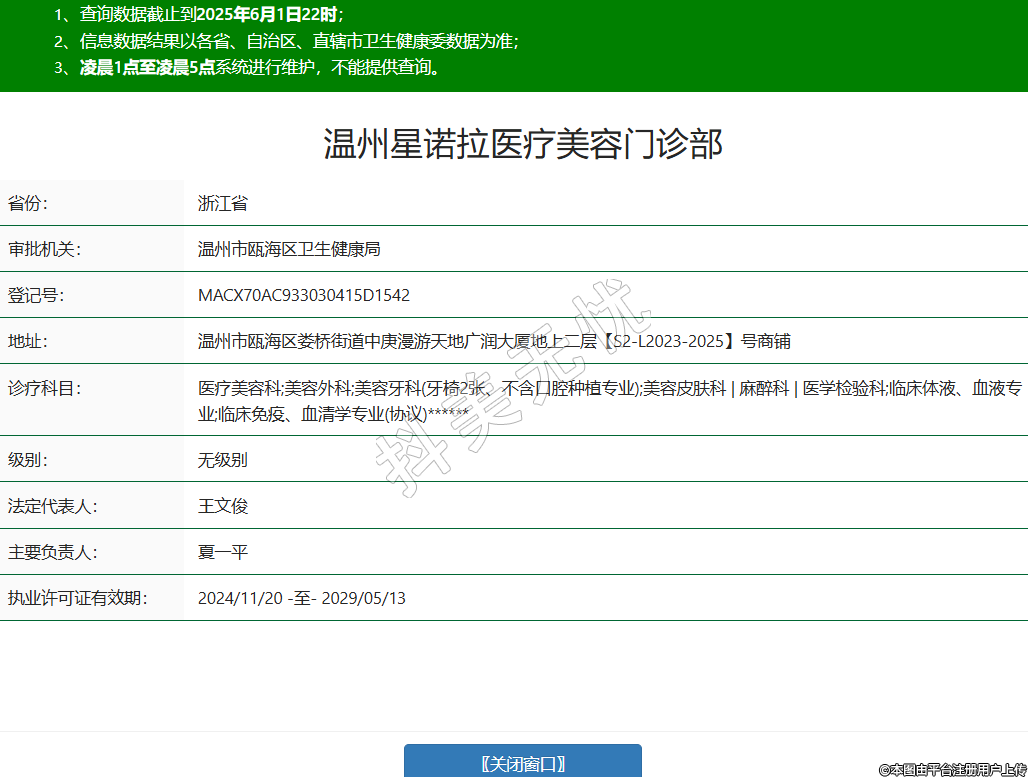 省份:浙江省審批機(jī)關(guān):溫州市甌海區(qū)衛(wèi)生健康局登記號:MACX70AC933030415D1542地址:溫州市甌海區(qū)婁橋街道中庚漫游天地廣潤大廈地上二層【S2-L2023-2025】號商鋪診療科目:醫(yī)療美容科;美容外科;美容牙科(牙椅2張、不含口腔種植專業(yè));美容皮膚科 | 麻醉科 | 醫(yī)學(xué)檢驗(yàn)科;臨床體液、血液專業(yè);臨床免疫、血清學(xué)專業(yè)(協(xié)議)******級別:無級別法定代表人:王文俊主要負(fù)責(zé)人:夏一平執(zhí)業(yè)許可證有效期:2024/11/20 -至- 2029/05/13 -