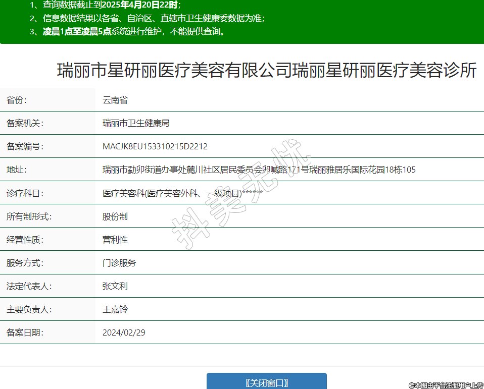 瑞麗市星研麗醫(yī)療美容有限公司瑞麗星研麗醫(yī)療美容診所,診療科目:醫(yī)療美容科(醫(yī)療美容外科、一級項目)******