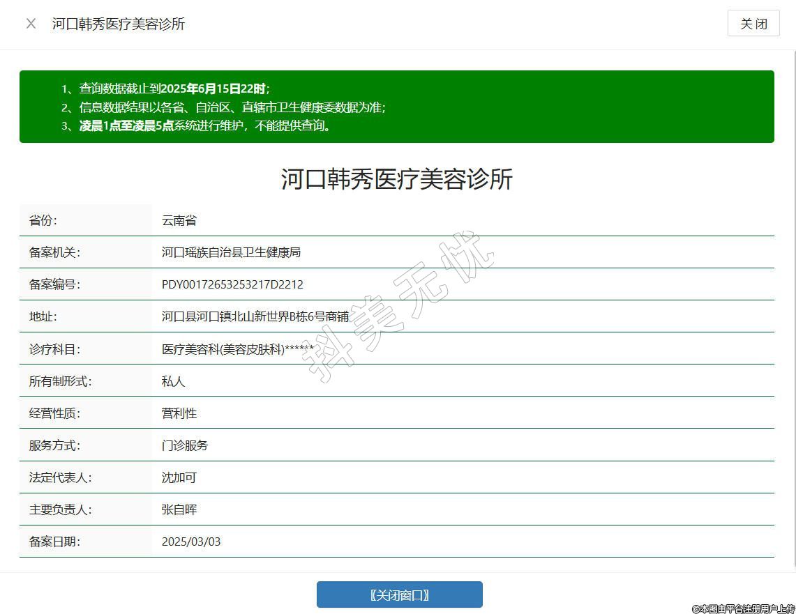 河口韓秀醫(yī)療美容診所成立于成立于2024年,位于河口縣河口鎮(zhèn)北山新世界B棟6號商鋪,是一家集醫(yī)療美容、皮膚管理中心、輕醫(yī)美、大健康、私人定制、為一體的集團管理公司,秉承"專業(yè)、安全、健康"的服務(wù)理念,擁有符合國家標(biāo)準(zhǔn)的診療環(huán)境和專業(yè)醫(yī)療團隊,嚴(yán)格遵循醫(yī)療美容行業(yè)規(guī)范開展服務(wù)項目。