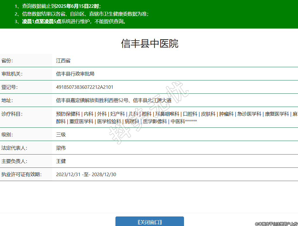 省份:江西省審批機(jī)關(guān):信豐縣行政審批局登記號:49185073836072212A2101地址:信豐縣嘉定鎮(zhèn)解放街勝利西巷52號、信豐縣北江源大道診療科目:預(yù)防保健科 | 內(nèi)科 | 外科 | 婦產(chǎn)科 | 兒科 | 眼科 | 耳鼻咽喉科 | 口腔科 | 皮膚科 | 腫瘤科 | 急診醫(yī)學(xué)科 | 康復(fù)醫(yī)學(xué)科 | 麻醉科 | 重癥醫(yī)學(xué)科 | 醫(yī)學(xué)檢驗(yàn)科 | 病理科 | 醫(yī)學(xué)影像科 | 中醫(yī)科******級別:三級法定代表人:梁偉主要負(fù)責(zé)人:王健執(zhí)業(yè)許可證有效期:2023/12/31 -至- 2028/12/30 -