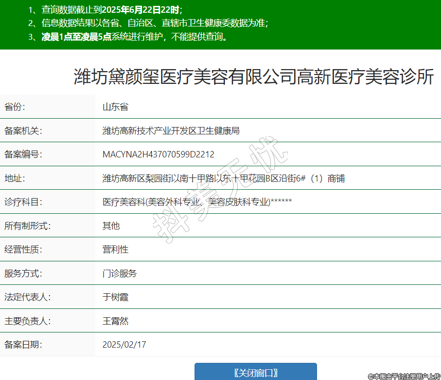 省份:山東省備案機(jī)關(guān):濰坊高新技術(shù)產(chǎn)業(yè)開發(fā)區(qū)衛(wèi)生健康局備案編號(hào):MACYNA2H437070599D2212地址:濰坊高新區(qū)梨園街以南十甲路以東十甲花園B區(qū)沿街6#(1)商鋪診療科目:醫(yī)療美容科(美容外科專業(yè)、美容皮膚科專業(yè))******所有制形式:其他經(jīng)營性質(zhì):營利性服務(wù)方式:門診服務(wù)法定代表人:于樹霞主要負(fù)責(zé)人:王霄然備案日期:2025/02/17 -