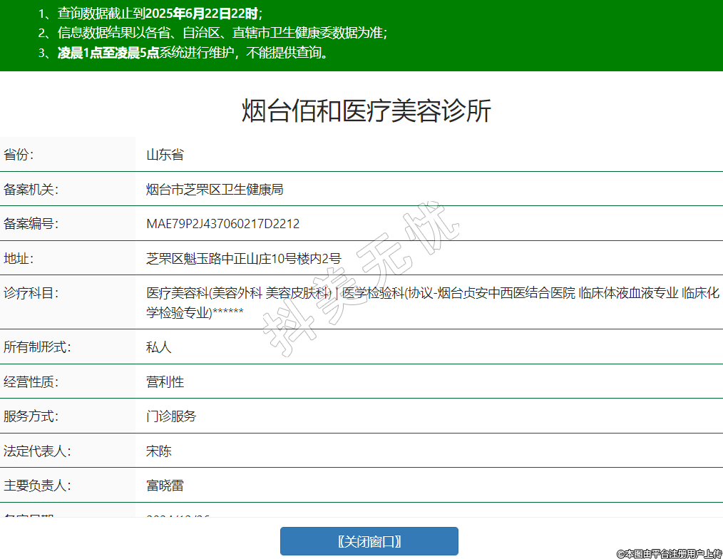 煙臺佰和醫(yī)療美容診所,診療科目:醫(yī)療美容科(美容外科 美容皮膚科) | 醫(yī)學(xué)檢驗科(協(xié)議-煙臺貞安中西醫(yī)結(jié)合醫(yī)院 臨床體液血液專業(yè) 臨床化學(xué)檢驗專業(yè))******