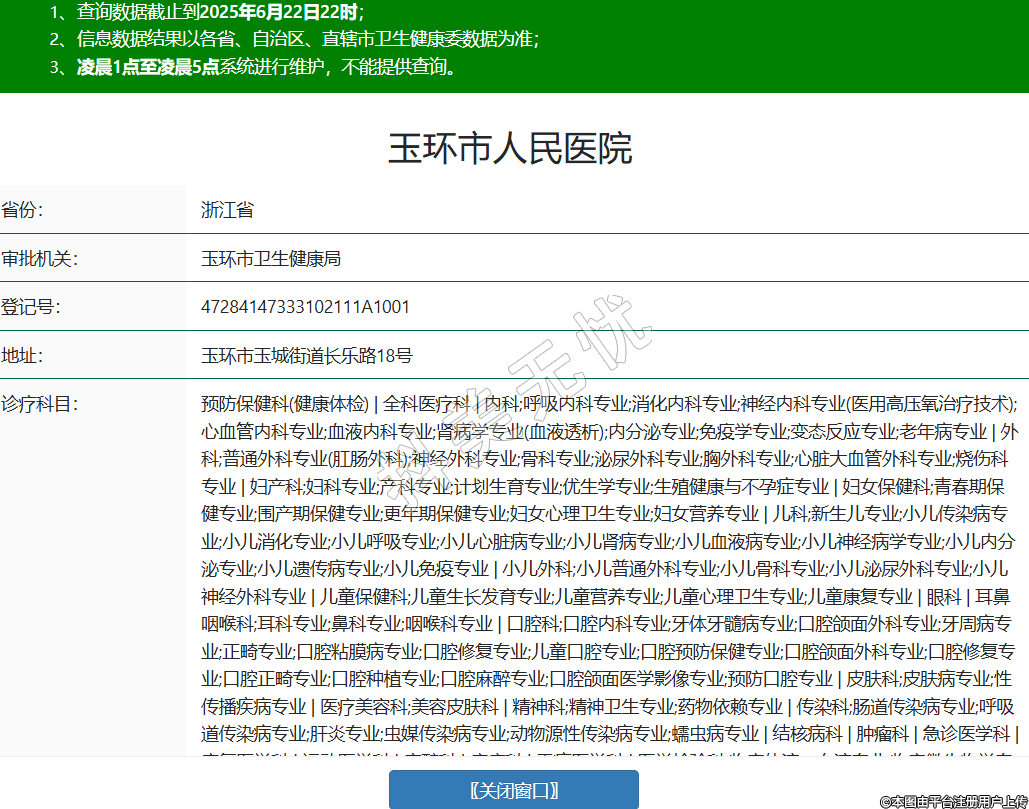 省份:浙江省審批機(jī)關(guān):玉環(huán)市衛(wèi)生健康局登記號:47284147333102111A1001地址:玉環(huán)市玉城街道長樂路18號診療科目:預(yù)防保健科(健康體檢) | 全科醫(yī)療科 | 內(nèi)科;呼吸內(nèi)科專業(yè);消化內(nèi)科專業(yè);神經(jīng)內(nèi)科專業(yè)(醫(yī)用高壓氧治療技術(shù));心血管內(nèi)科專業(yè);血液內(nèi)科專業(yè);腎病學(xué)專業(yè)(血液透析);內(nèi)分泌專業(yè);免疫學(xué)專業(yè);變態(tài)反應(yīng)專業(yè);老年病專業(yè) | 外科;普通外科專業(yè)(肛腸外科);神經(jīng)外科專業(yè);骨科專業(yè);泌尿外科專業(yè);胸外科專業(yè);心臟大血管外科專業(yè);燒傷科專業(yè) | 婦產(chǎn)科;婦科專業(yè);產(chǎn)科專業(yè);計(jì)劃生育專業(yè);優(yōu)生學(xué)專業(yè);生殖健康與不孕癥專業(yè) | 婦女保健科;青春期保健專業(yè);圍產(chǎn)期保健專業(yè);更年期保健專業(yè);婦女心理衛(wèi)生專業(yè);婦女營養(yǎng)專業(yè) | 兒科;新生兒專業(yè);小兒傳染病專業(yè);小兒消化專業(yè);小兒呼吸專業(yè);小兒心臟病專業(yè);小兒腎病專業(yè);小兒血液病專業(yè);小兒神經(jīng)病學(xué)專業(yè);小兒內(nèi)分泌專業(yè);小兒遺傳病專業(yè);小兒免疫專業(yè) | 小兒外科;小兒普通外科專業(yè);小兒骨科專業(yè);小兒泌尿外科專業(yè);小兒神經(jīng)外科專業(yè) | 兒童保健科;兒童生長發(fā)育專業(yè);兒童營養(yǎng)專業(yè);兒童心理衛(wèi)生專業(yè);兒童康復(fù)專業(yè) | 眼科 | 耳鼻咽喉科;耳科專業(yè);鼻科專業(yè);咽喉科專業(yè) | 口腔科;口腔內(nèi)科專業(yè);牙體牙髓病專業(yè);口腔頜面外科專業(yè);牙周病專業(yè);正畸專業(yè);口腔粘膜病專業(yè);口腔修復(fù)專業(yè);兒童口腔專業(yè);口腔預(yù)防保健專業(yè);口腔頜面外科專業(yè);口腔修復(fù)專業(yè);口腔正畸專業(yè);口腔種植專業(yè);口腔麻醉專業(yè);口腔頜面醫(yī)學(xué)影像專業(yè);預(yù)防口腔專業(yè) | 皮膚科;皮膚病專業(yè);性傳播疾病專業(yè) | 醫(yī)療美容科;美容皮膚科 | 精神科;精神衛(wèi)生專業(yè);藥物依賴專業(yè) | 傳染科;腸道傳染病專業(yè);呼吸道傳染病專業(yè);肝炎專業(yè);蟲媒傳染病專業(yè);動(dòng)物源性傳染病專業(yè);蠕蟲病專業(yè) | 結(jié)核病科 | 腫瘤科 | 急診醫(yī)學(xué)科 | 康復(fù)醫(yī)學(xué)科 | 運(yùn)動(dòng)醫(yī)學(xué)科 | 麻醉科 | 疼痛科 | 重癥醫(yī)學(xué)科 | 醫(yī)學(xué)檢驗(yàn)科;臨床體液、血液專業(yè);臨床微生物學(xué)專業(yè);臨床化學(xué)檢驗(yàn)專業(yè);臨床免疫、血清學(xué)專業(yè);臨床細(xì)胞分子遺傳學(xué)專業(yè) | 病理科 | 醫(yī)學(xué)影像科;X線診斷專業(yè);CT診斷專業(yè);磁共振成像診斷專業(yè);超聲診斷專業(yè);心電診斷專業(yè);腦電及腦血流圖診斷專業(yè);神經(jīng)肌肉電圖專業(yè);介入放射學(xué)專業(yè) | 中醫(yī)科;內(nèi)科專業(yè);外科專業(yè);婦產(chǎn)科專業(yè);兒科專業(yè);皮膚科專業(yè);眼科專業(yè);耳鼻咽喉科專業(yè);腫瘤科專業(yè);骨傷科專業(yè);針灸科專業(yè);推拿科專業(yè);康復(fù)醫(yī)學(xué)專業(yè) | 中西醫(yī)結(jié)合科******級別:三級法定代表人:董寅主要負(fù)責(zé)人:陳增瑞執(zhí)業(yè)許可證有效期:2021/05/31 -至- 2034/05/22 -