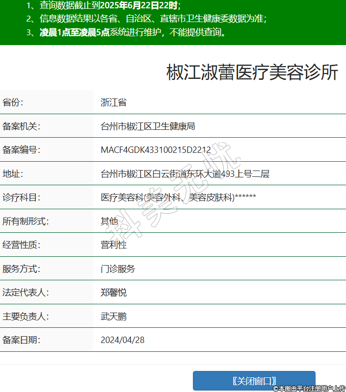 省份:浙江省備案機關(guān):臺州市椒江區(qū)衛(wèi)生健康局備案編號:MACF4GDK433100215D2212地址:臺州市椒江區(qū)白云街道東環(huán)大道493上號二層診療科目:醫(yī)療美容科(美容外科、美容皮膚科)******所有制形式:其他經(jīng)營性質(zhì):營利性服務(wù)方式:門診服務(wù)法定代表人:鄭馨悅主要負責(zé)人:武天鵬備案日期:2024/04/28 -