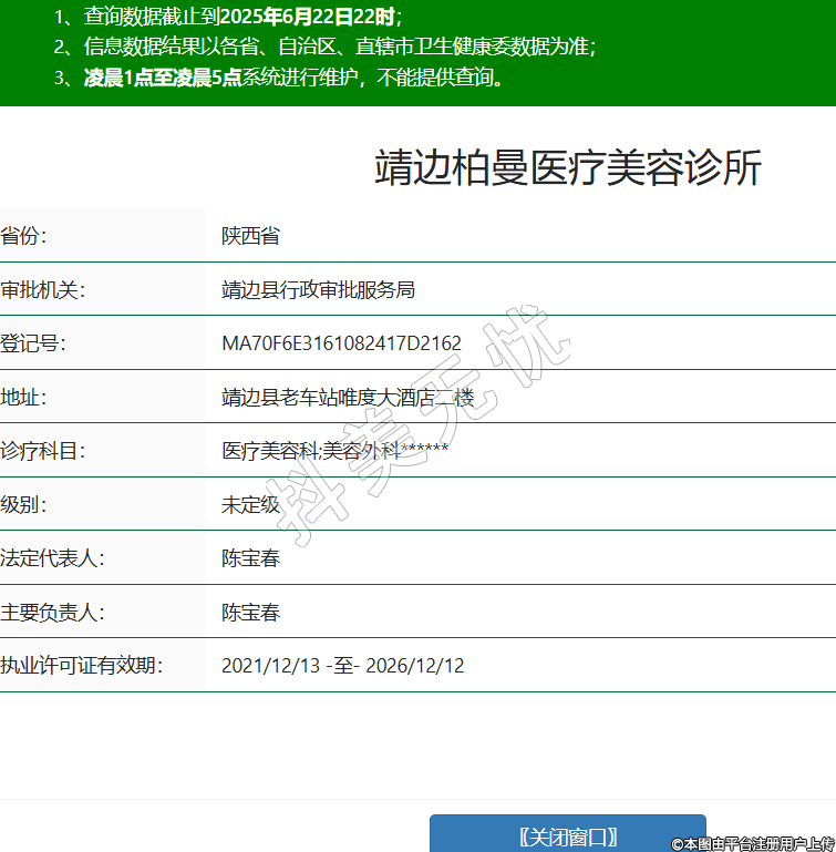 省份:陜西省審批機(jī)關(guān):靖邊縣行政審批服務(wù)局登記號(hào):MA70F6E3161082417D2162地址:靖邊縣老車站唯度大酒店二樓診療科目:醫(yī)療美容科;美容外科******級(jí)別:未定級(jí)法定代表人:陳寶春主要負(fù)責(zé)人:陳寶春執(zhí)業(yè)許可證有效期:2021/12/13 -至- 2026/12/12 -