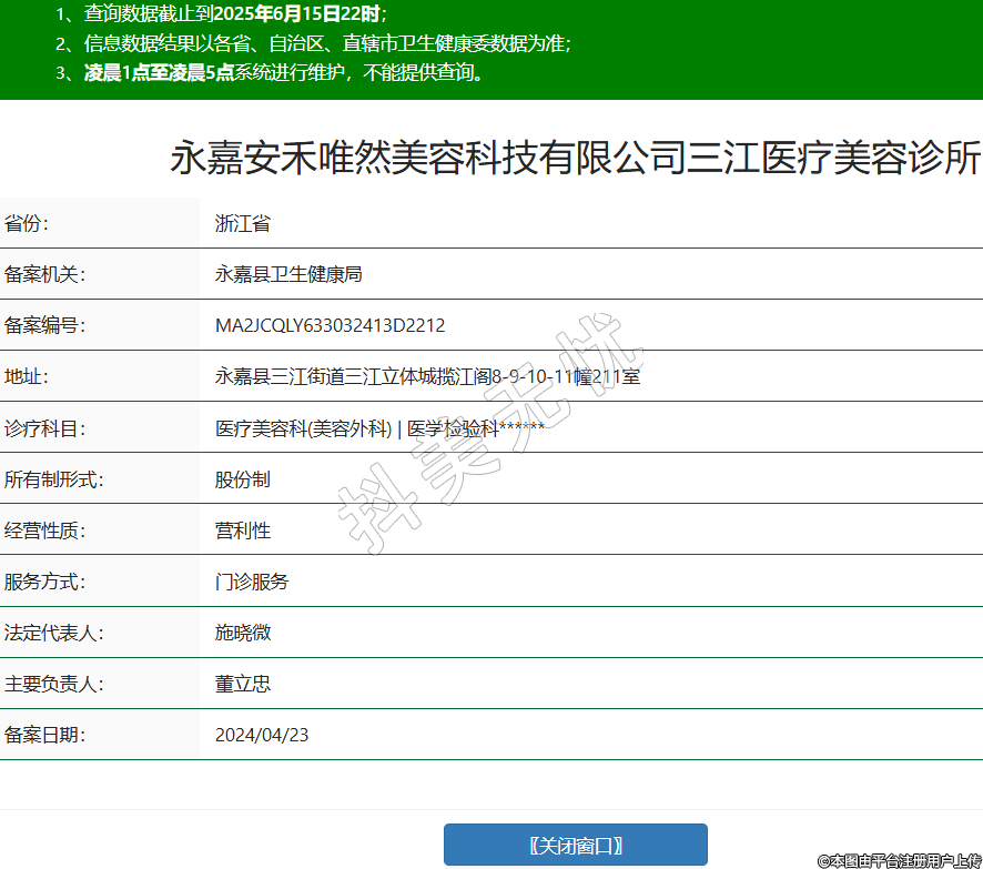 省份:浙江省備案機關:永嘉縣衛(wèi)生健康局備案編號:MA2JCQLY633032413D2212地址:永嘉縣三江街道三江立體城攬江閣8-9-10-11幢211室診療科目:醫(yī)療美容科(美容外科) | 醫(yī)學檢驗科******所有制形式:股份制經營性質:營利性服務方式:門診服務法定代表人:施曉微主要負責人:董立忠備案日期:2024/04/23 -