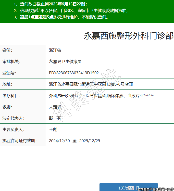 省份:浙江省審批機(jī)關(guān):永嘉縣衛(wèi)生健康局登記號(hào):PDY82306733032413D1502地址:浙江省永嘉縣甌北街道五中花園13幢6-8號(hào)店面診療科目:外科;整形外科專業(yè) | 醫(yī)學(xué)檢驗(yàn)科;臨床體液、血液專業(yè)******級(jí)別:未定級(jí)法定代表人:戴一芬主要負(fù)責(zé)人:王彪執(zhí)業(yè)許可證有效期:2024/12/30 -至- 2029/12/29 -