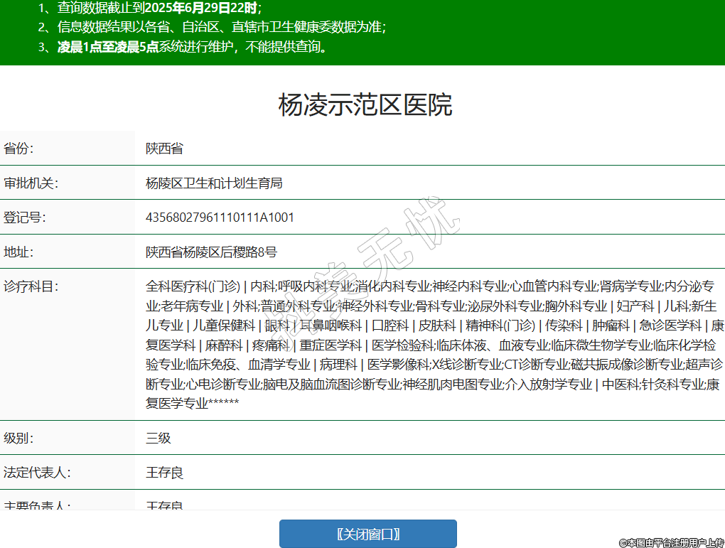 省份:陜西省審批機(jī)關(guān):楊陵區(qū)衛(wèi)生和計(jì)劃生育局登記號(hào):43568027961110111A1001地址:陜西省楊陵區(qū)后稷路8號(hào)診療科目:全科醫(yī)療科(門診) | 內(nèi)科;呼吸內(nèi)科專業(yè);消化內(nèi)科專業(yè);神經(jīng)內(nèi)科專業(yè);心血管內(nèi)科專業(yè);腎病學(xué)專業(yè);內(nèi)分泌專業(yè);老年病專業(yè) | 外科;普通外科專業(yè);神經(jīng)外科專業(yè);骨科專業(yè);泌尿外科專業(yè);胸外科專業(yè) | 婦產(chǎn)科 | 兒科;新生兒專業(yè) | 兒童保健科 | 眼科 | 耳鼻咽喉科 | 口腔科 | 皮膚科 | 精神科(門診) | 傳染科 | 腫瘤科 | 急診醫(yī)學(xué)科 | 康復(fù)醫(yī)學(xué)科 | 麻醉科 | 疼痛科 | 重癥醫(yī)學(xué)科 | 醫(yī)學(xué)檢驗(yàn)科;臨床體液、血液專業(yè);臨床微生物學(xué)專業(yè);臨床化學(xué)檢驗(yàn)專業(yè);臨床免疫、血清學(xué)專業(yè) | 病理科 | 醫(yī)學(xué)影像科;X線診斷專業(yè);CT診斷專業(yè);磁共振成像診斷專業(yè);超聲診斷專業(yè);心電診斷專業(yè);腦電及腦血流圖診斷專業(yè);神經(jīng)肌肉電圖專業(yè);介入放射學(xué)專業(yè) | 中醫(yī)科;針灸科專業(yè);康復(fù)醫(yī)學(xué)專業(yè)******級(jí)別:三級(jí)法定代表人:王存良主要負(fù)責(zé)人:王存良執(zhí)業(yè)許可證有效期:2022/10/14 -至- 2027/10/15 -