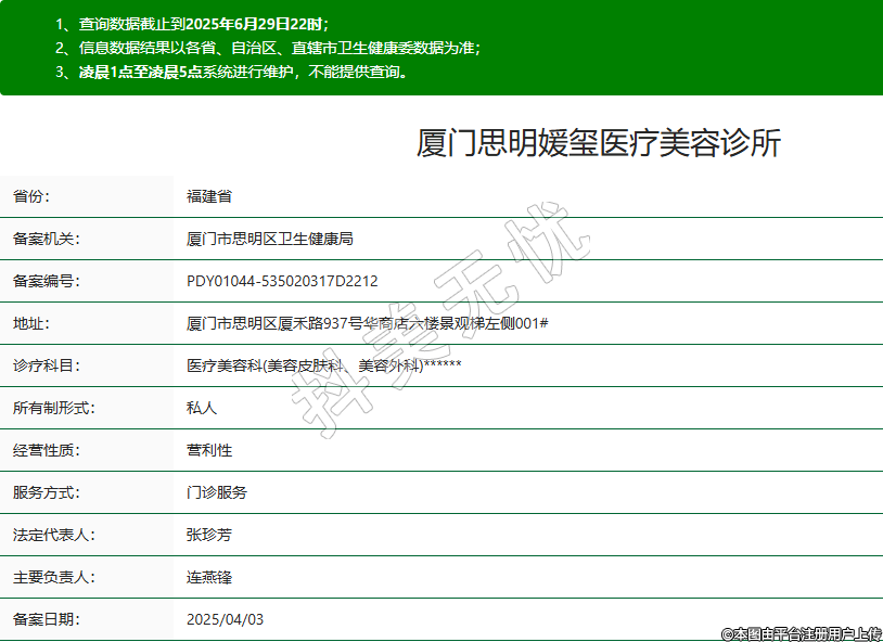 省份:福建省備案機關(guān):廈門市思明區(qū)衛(wèi)生健康局備案編號:PDY01044-535020317D2212地址:廈門市思明區(qū)廈禾路937號華商店六樓景觀梯左側(cè)001#診療科目:醫(yī)療美容科(美容皮膚科、美容外科)******所有制形式:私人經(jīng)營性質(zhì):營利性服務(wù)方式:門診服務(wù)法定代表人:張珍芳主要負責人:連燕鋒備案日期:2025/04/03 -