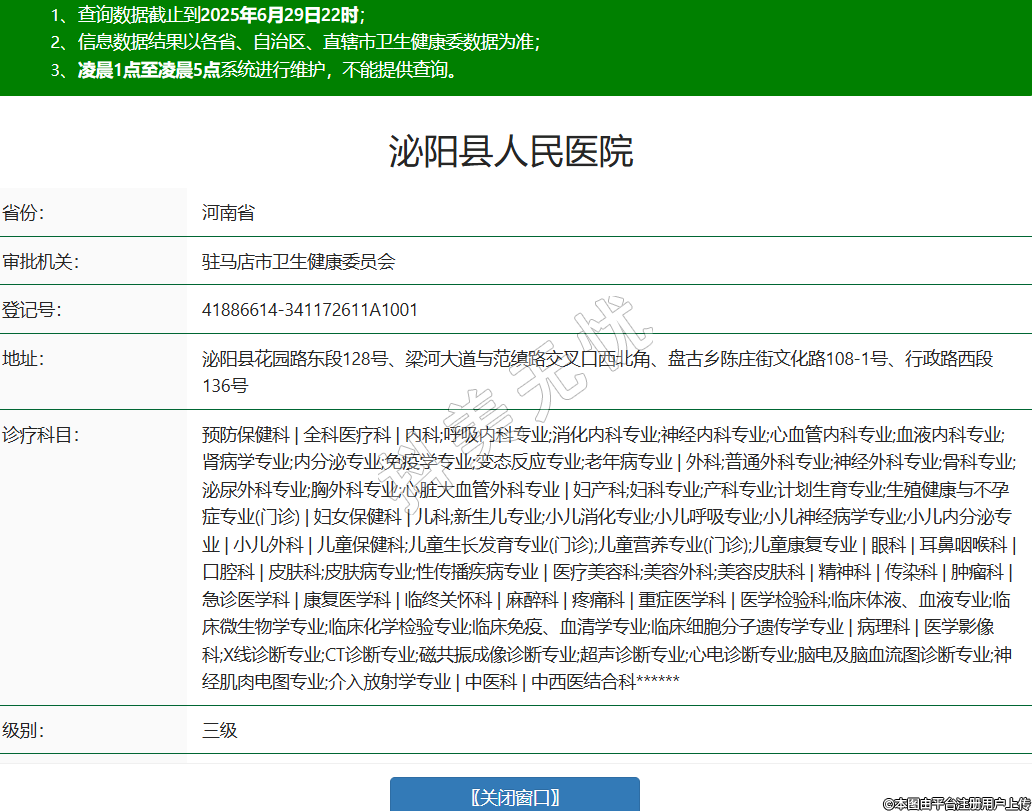 省份:河南省審批機關(guān):駐馬店市衛(wèi)生健康委員會登記號:41886614-341172611A1001地址:泌陽縣花園路東段128號、梁河大道與范縝路交叉口西北角、盤古鄉(xiāng)陳莊街文化路108-1號、行政路西段136號診療科目:預(yù)防保健科 | 全科醫(yī)療科 | 內(nèi)科;呼吸內(nèi)科專業(yè);消化內(nèi)科專業(yè);神經(jīng)內(nèi)科專業(yè);心血管內(nèi)科專業(yè);血液內(nèi)科專業(yè);腎病學(xué)專業(yè);內(nèi)分泌專業(yè);免疫學(xué)專業(yè);變態(tài)反應(yīng)專業(yè);老年病專業(yè) | 外科;普通外科專業(yè);神經(jīng)外科專業(yè);骨科專業(yè);泌尿外科專業(yè);胸外科專業(yè);心臟大血管外科專業(yè) | 婦產(chǎn)科;婦科專業(yè);產(chǎn)科專業(yè);計劃生育專業(yè);生殖健康與不孕癥專業(yè)(門診) | 婦女保健科 | 兒科;新生兒專業(yè);小兒消化專業(yè);小兒呼吸專業(yè);小兒神經(jīng)病學(xué)專業(yè);小兒內(nèi)分泌專業(yè) | 小兒外科 | 兒童保健科;兒童生長發(fā)育專業(yè)(門診);兒童營養(yǎng)專業(yè)(門診);兒童康復(fù)專業(yè) | 眼科 | 耳鼻咽喉科 | 口腔科 | 皮膚科;皮膚病專業(yè);性傳播疾病專業(yè) | 醫(yī)療美容科;美容外科;美容皮膚科 | 精神科 | 傳染科 | 腫瘤科 | 急診醫(yī)學(xué)科 | 康復(fù)醫(yī)學(xué)科 | 臨終關(guān)懷科 | 麻醉科 | 疼痛科 | 重癥醫(yī)學(xué)科 | 醫(yī)學(xué)檢驗科;臨床體液、血液專業(yè);臨床微生物學(xué)專業(yè);臨床化學(xué)檢驗專業(yè);臨床免疫、血清學(xué)專業(yè);臨床細胞分子遺傳學(xué)專業(yè) | 病理科 | 醫(yī)學(xué)影像科;X線診斷專業(yè);CT診斷專業(yè);磁共振成像診斷專業(yè);超聲診斷專業(yè);心電診斷專業(yè);腦電及腦血流圖診斷專業(yè);神經(jīng)肌肉電圖專業(yè);介入放射學(xué)專業(yè) | 中醫(yī)科 | 中西醫(yī)結(jié)合科******級別:三級法定代表人:賈浩主要負責人:賈浩執(zhí)業(yè)許可證有效期:2025/03/10 -至- 2036/01/07 -