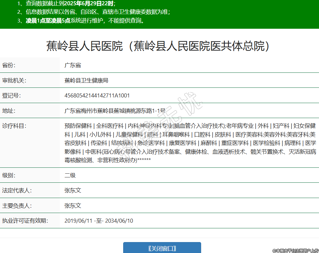 省份:廣東省審批機(jī)關(guān):蕉嶺縣衛(wèi)生健康局登記號(hào):45680542144142711A1001地址:廣東省梅州市蕉嶺縣蕉城鎮(zhèn)桃源東路1-1號(hào)診療科目:預(yù)防保健科 | 全科醫(yī)療科 | 內(nèi)科;神經(jīng)內(nèi)科專(zhuān)業(yè)(腦血管介入治療技術(shù));老年病專(zhuān)業(yè) | 外科 | 婦產(chǎn)科 | 婦女保健科 | 兒科 | 小兒外科 | 兒童保健科 | 眼科 | 耳鼻咽喉科 | 口腔科 | 皮膚科 | 醫(yī)療美容科;美容外科;美容牙科;美容皮膚科 | 傳染科 | 結(jié)核病科 | 急診醫(yī)學(xué)科 | 康復(fù)醫(yī)學(xué)科 | 麻醉科 | 重癥醫(yī)學(xué)科 | 醫(yī)學(xué)檢驗(yàn)科 | 病理科 | 醫(yī)學(xué)影像科 | 中醫(yī)科(冠心病心導(dǎo)管介入治療技術(shù)備案、健康體檢、血液透析技術(shù)、髖關(guān)節(jié)置換術(shù)、滅活新冠病毒核酸檢測(cè)、非營(yíng)利性政府辦)******級(jí)別:二級(jí)法定代表人:張東文主要負(fù)責(zé)人:張東文執(zhí)業(yè)許可證有效期:2019/06/11 -至- 2034/06/10 -