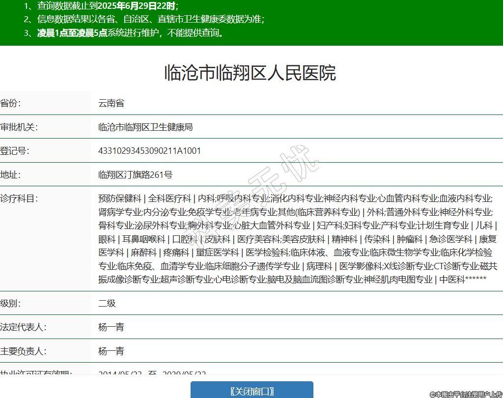 省份:云南省審批機(jī)關(guān):臨滄市臨翔區(qū)衛(wèi)生健康局登記號:43310293453090211A1001地址:臨翔區(qū)汀旗路261號診療科目:預(yù)防保健科 | 全科醫(yī)療科 | 內(nèi)科;呼吸內(nèi)科專業(yè);消化內(nèi)科專業(yè);神經(jīng)內(nèi)科專業(yè);心血管內(nèi)科專業(yè);血液內(nèi)科專業(yè);腎病學(xué)專業(yè);內(nèi)分泌專業(yè);免疫學(xué)專業(yè);老年病專業(yè);其他(臨床營養(yǎng)科專業(yè)) | 外科;普通外科專業(yè);神經(jīng)外科專業(yè);骨科專業(yè);泌尿外科專業(yè);胸外科專業(yè);心臟大血管外科專業(yè) | 婦產(chǎn)科;婦科專業(yè);產(chǎn)科專業(yè);計(jì)劃生育專業(yè) | 兒科 | 眼科 | 耳鼻咽喉科 | 口腔科 | 皮膚科 | 醫(yī)療美容科;美容皮膚科 | 精神科 | 傳染科 | 腫瘤科 | 急診醫(yī)學(xué)科 | 康復(fù)醫(yī)學(xué)科 | 麻醉科 | 疼痛科 | 重癥醫(yī)學(xué)科 | 醫(yī)學(xué)檢驗(yàn)科;臨床體液、血液專業(yè);臨床微生物學(xué)專業(yè);臨床化學(xué)檢驗(yàn)專業(yè);臨床免疫、血清學(xué)專業(yè);臨床細(xì)胞分子遺傳學(xué)專業(yè) | 病理科 | 醫(yī)學(xué)影像科;X線診斷專業(yè);CT診斷專業(yè);磁共振成像診斷專業(yè);超聲診斷專業(yè);心電診斷專業(yè);腦電及腦血流圖診斷專業(yè);神經(jīng)肌肉電圖專業(yè) | 中醫(yī)科******級別:二級法定代表人:楊一青主要負(fù)責(zé)人:楊一青執(zhí)業(yè)許可證有效期:2014/05/23 -至- 2029/05/22 -