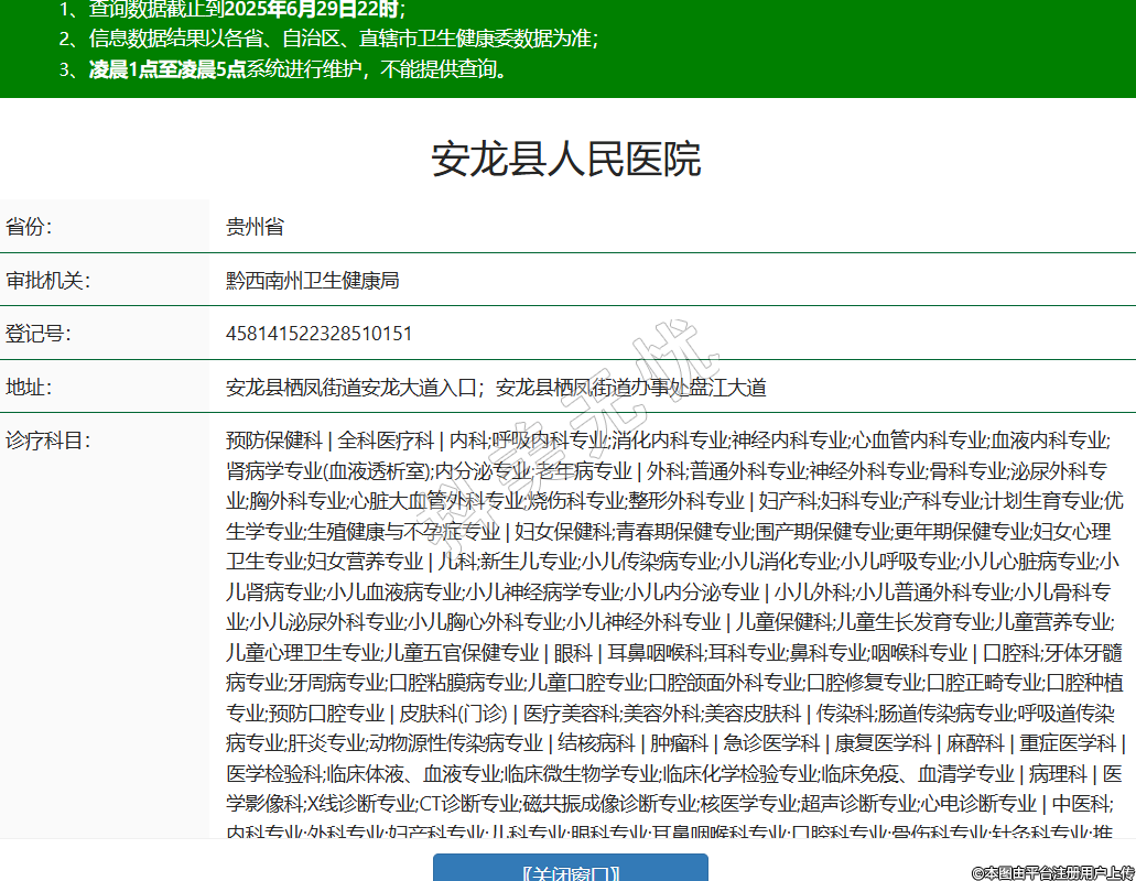 省份:貴州省審批機關(guān):黔西南州衛(wèi)生健康局登記號:458141522328510151地址:安龍縣棲鳳街道安龍大道入口;安龍縣棲鳳街道辦事處盤江大道診療科目:預(yù)防保健科 | 全科醫(yī)療科 | 內(nèi)科;呼吸內(nèi)科專業(yè);消化內(nèi)科專業(yè);神經(jīng)內(nèi)科專業(yè);心血管內(nèi)科專業(yè);血液內(nèi)科專業(yè);腎病學(xué)專業(yè)(血液透析室);內(nèi)分泌專業(yè);老年病專業(yè) | 外科;普通外科專業(yè);神經(jīng)外科專業(yè);骨科專業(yè);泌尿外科專業(yè);胸外科專業(yè);心臟大血管外科專業(yè);燒傷科專業(yè);整形外科專業(yè) | 婦產(chǎn)科;婦科專業(yè);產(chǎn)科專業(yè);計劃生育專業(yè);優(yōu)生學(xué)專業(yè);生殖健康與不孕癥專業(yè) | 婦女保健科;青春期保健專業(yè);圍產(chǎn)期保健專業(yè);更年期保健專業(yè);婦女心理衛(wèi)生專業(yè);婦女營養(yǎng)專業(yè) | 兒科;新生兒專業(yè);小兒傳染病專業(yè);小兒消化專業(yè);小兒呼吸專業(yè);小兒心臟病專業(yè);小兒腎病專業(yè);小兒血液病專業(yè);小兒神經(jīng)病學(xué)專業(yè);小兒內(nèi)分泌專業(yè) | 小兒外科;小兒普通外科專業(yè);小兒骨科專業(yè);小兒泌尿外科專業(yè);小兒胸心外科專業(yè);小兒神經(jīng)外科專業(yè) | 兒童保健科;兒童生長發(fā)育專業(yè);兒童營養(yǎng)專業(yè);兒童心理衛(wèi)生專業(yè);兒童五官保健專業(yè) | 眼科 | 耳鼻咽喉科;耳科專業(yè);鼻科專業(yè);咽喉科專業(yè) | 口腔科;牙體牙髓病專業(yè);牙周病專業(yè);口腔粘膜病專業(yè);兒童口腔專業(yè);口腔頜面外科專業(yè);口腔修復(fù)專業(yè);口腔正畸專業(yè);口腔種植專業(yè);預(yù)防口腔專業(yè) | 皮膚科(門診) | 醫(yī)療美容科;美容外科;美容皮膚科 | 傳染科;腸道傳染病專業(yè);呼吸道傳染病專業(yè);肝炎專業(yè);動物源性傳染病專業(yè) | 結(jié)核病科 | 腫瘤科 | 急診醫(yī)學(xué)科 | 康復(fù)醫(yī)學(xué)科 | 麻醉科 | 重癥醫(yī)學(xué)科 | 醫(yī)學(xué)檢驗科;臨床體液、血液專業(yè);臨床微生物學(xué)專業(yè);臨床化學(xué)檢驗專業(yè);臨床免疫、血清學(xué)專業(yè) | 病理科 | 醫(yī)學(xué)影像科;X線診斷專業(yè);CT診斷專業(yè);磁共振成像診斷專業(yè);核醫(yī)學(xué)專業(yè);超聲診斷專業(yè);心電診斷專業(yè) | 中醫(yī)科;內(nèi)科專業(yè);外科專業(yè);婦產(chǎn)科專業(yè);兒科專業(yè);眼科專業(yè);耳鼻咽喉科專業(yè);口腔科專業(yè);骨傷科專業(yè);針灸科專業(yè);推拿科專業(yè);康復(fù)醫(yī)學(xué)專業(yè);急診科專業(yè);預(yù)防保健科專業(yè) | 中西醫(yī)結(jié)合科******級別:二級法定代表人:謝勇主要負責(zé)人:謝勇執(zhí)業(yè)許可證有效期:2014/10/14 -至- 2029/10/13 -