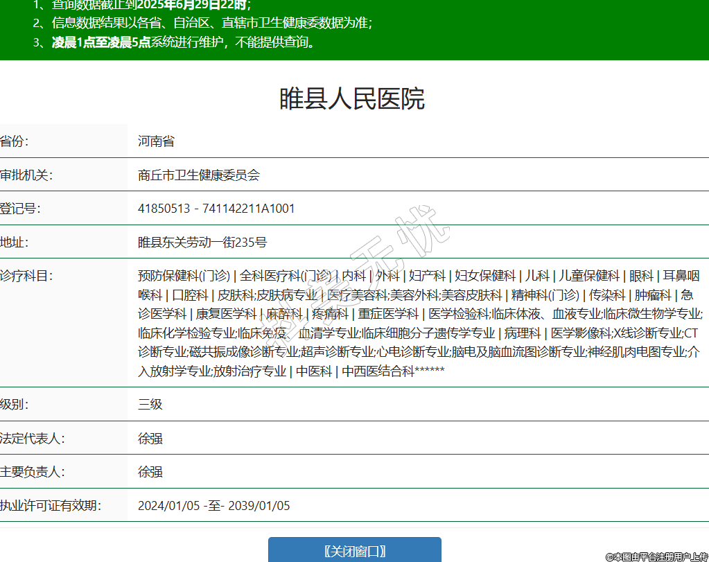 省份:河南省審批機(jī)關(guān):商丘市衛(wèi)生健康委員會(huì)登記號(hào):41850513-741142211A1001地址:睢縣東關(guān)勞動(dòng)一街235號(hào)診療科目:預(yù)防保健科(門(mén)診) | 全科醫(yī)療科(門(mén)診) | 內(nèi)科 | 外科 | 婦產(chǎn)科 | 婦女保健科 | 兒科 | 兒童保健科 | 眼科 | 耳鼻咽喉科 | 口腔科 | 皮膚科;皮膚病專(zhuān)業(yè) | 醫(yī)療美容科;美容外科;美容皮膚科 | 精神科(門(mén)診) | 傳染科 | 腫瘤科 | 急診醫(yī)學(xué)科 | 康復(fù)醫(yī)學(xué)科 | 麻醉科 | 疼痛科 | 重癥醫(yī)學(xué)科 | 醫(yī)學(xué)檢驗(yàn)科;臨床體液、血液專(zhuān)業(yè);臨床微生物學(xué)專(zhuān)業(yè);臨床化學(xué)檢驗(yàn)專(zhuān)業(yè);臨床免疫、血清學(xué)專(zhuān)業(yè);臨床細(xì)胞分子遺傳學(xué)專(zhuān)業(yè) | 病理科 | 醫(yī)學(xué)影像科;X線(xiàn)診斷專(zhuān)業(yè);CT診斷專(zhuān)業(yè);磁共振成像診斷專(zhuān)業(yè);超聲診斷專(zhuān)業(yè);心電診斷專(zhuān)業(yè);腦電及腦血流圖診斷專(zhuān)業(yè);神經(jīng)肌肉電圖專(zhuān)業(yè);介入放射學(xué)專(zhuān)業(yè);放射治療專(zhuān)業(yè) | 中醫(yī)科 | 中西醫(yī)結(jié)合科******級(jí)別:三級(jí)法定代表人:徐強(qiáng)主要負(fù)責(zé)人:徐強(qiáng)執(zhí)業(yè)許可證有效期:2024/01/05 -至- 2039/01/05 -