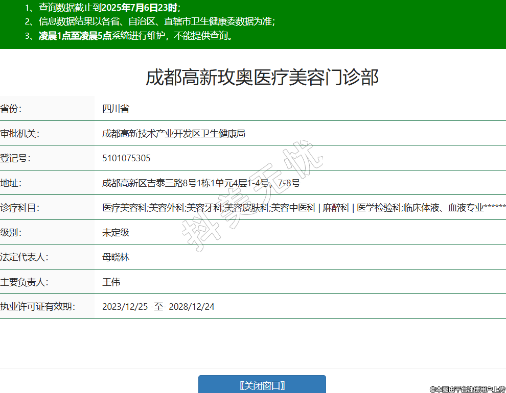 省份:四川省審批機(jī)關(guān):成都高新技術(shù)產(chǎn)業(yè)開發(fā)區(qū)衛(wèi)生健康局登記號(hào):5101075305地址:成都高新區(qū)吉泰三路8號(hào)1棟1單元4層1-4號(hào),7-8號(hào)診療科目:醫(yī)療美容科;美容外科;美容牙科;美容皮膚科;美容中醫(yī)科 | 麻醉科 | 醫(yī)學(xué)檢驗(yàn)科;臨床體液、血液專業(yè)******級(jí)別:未定級(jí)法定代表人:母曉林主要負(fù)責(zé)人:王偉執(zhí)業(yè)許可證有效期:2023/12/25 -至- 2028/12/24 -