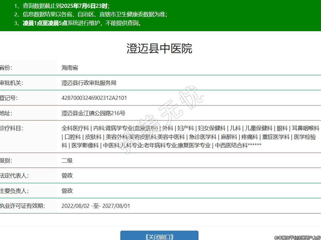省份:海南省審批機(jī)關(guān):澄邁縣行政審批服務(wù)局登記號(hào):42870003246902312A2101地址:澄邁縣金江鎮(zhèn)公園路216號(hào)診療科目:全科醫(yī)療科 | 內(nèi)科;腎病學(xué)專業(yè)(血液透析) | 外科 | 婦產(chǎn)科 | 婦女保健科 | 兒科 | 兒童保健科 | 眼科 | 耳鼻咽喉科 | 口腔科 | 皮膚科 | 美容外科;美容皮膚科;美容中醫(yī)科 | 急診醫(yī)學(xué)科 | 麻醉科 | 疼痛科 | 重癥醫(yī)學(xué)科 | 醫(yī)學(xué)檢驗(yàn)科 | 醫(yī)學(xué)影像科 | 中醫(yī)科;兒科專業(yè);老年病科專業(yè);康復(fù)醫(yī)學(xué)專業(yè) | 中西醫(yī)結(jié)合科******級(jí)別:二級(jí)法定代表人:曾政主要負(fù)責(zé)人:曾政執(zhí)業(yè)許可證有效期:2022/08/02 -至- 2027/08/01 -