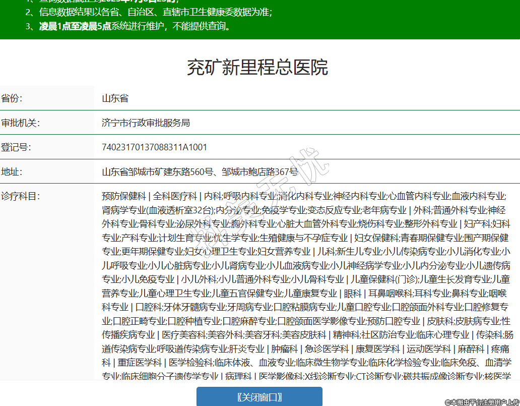 省份:山東省審批機(jī)關(guān):濟(jì)寧市行政審批服務(wù)局登記號(hào):74023170137088311A1001地址:山東省鄒城市礦建東路560號(hào)、鄒城市鮑店路367號(hào)診療科目:預(yù)防保健科 | 全科醫(yī)療科 | 內(nèi)科;呼吸內(nèi)科專業(yè);消化內(nèi)科專業(yè);神經(jīng)內(nèi)科專業(yè);心血管內(nèi)科專業(yè);血液內(nèi)科專業(yè);腎病學(xué)專業(yè)(血液透析室32臺(tái));內(nèi)分泌專業(yè);免疫學(xué)專業(yè);變態(tài)反應(yīng)專業(yè);老年病專業(yè) | 外科;普通外科專業(yè);神經(jīng)外科專業(yè);骨科專業(yè);泌尿外科專業(yè);胸外科專業(yè);心臟大血管外科專業(yè);燒傷科專業(yè);整形外科專業(yè) | 婦產(chǎn)科;婦科專業(yè);產(chǎn)科專業(yè);計(jì)劃生育專業(yè);優(yōu)生學(xué)專業(yè);生殖健康與不孕癥專業(yè) | 婦女保健科;青春期保健專業(yè);圍產(chǎn)期保健專業(yè);更年期保健專業(yè);婦女心理衛(wèi)生專業(yè);婦女營(yíng)養(yǎng)專業(yè) | 兒科;新生兒專業(yè);小兒傳染病專業(yè);小兒消化專業(yè);小兒呼吸專業(yè);小兒心臟病專業(yè);小兒腎病專業(yè);小兒血液病專業(yè);小兒神經(jīng)病學(xué)專業(yè);小兒內(nèi)分泌專業(yè);小兒遺傳病專業(yè);小兒免疫專業(yè) | 小兒外科;小兒普通外科專業(yè);小兒骨科專業(yè) | 兒童保健科(門診);兒童生長(zhǎng)發(fā)育專業(yè);兒童營(yíng)養(yǎng)專業(yè);兒童心理衛(wèi)生專業(yè);兒童五官保健專業(yè);兒童康復(fù)專業(yè) | 眼科 | 耳鼻咽喉科;耳科專業(yè);鼻科專業(yè);咽喉科專業(yè) | 口腔科;牙體牙髓病專業(yè);牙周病專業(yè);口腔粘膜病專業(yè);兒童口腔專業(yè);口腔頜面外科專業(yè);口腔修復(fù)專業(yè);口腔正畸專業(yè);口腔種植專業(yè);口腔麻醉專業(yè);口腔頜面醫(yī)學(xué)影像專業(yè);預(yù)防口腔專業(yè) | 皮膚科;皮膚病專業(yè);性傳播疾病專業(yè) | 醫(yī)療美容科;美容外科;美容牙科;美容皮膚科 | 精神科;社區(qū)防治專業(yè);臨床心理專業(yè) | 傳染科;腸道傳染病專業(yè);呼吸道傳染病專業(yè);肝炎專業(yè) | 腫瘤科 | 急診醫(yī)學(xué)科 | 康復(fù)醫(yī)學(xué)科 | 運(yùn)動(dòng)醫(yī)學(xué)科 | 麻醉科 | 疼痛科 | 重癥醫(yī)學(xué)科 | 醫(yī)學(xué)檢驗(yàn)科;臨床體液、血液專業(yè);臨床微生物學(xué)專業(yè);臨床化學(xué)檢驗(yàn)專業(yè);臨床免疫、血清學(xué)專業(yè);臨床細(xì)胞分子遺傳學(xué)專業(yè) | 病理科 | 醫(yī)學(xué)影像科;X線診斷專業(yè);CT診斷專業(yè);磁共振成像診斷專業(yè);核醫(yī)學(xué)專業(yè);超聲診斷專業(yè);心電診斷專業(yè);腦電及腦血流圖診斷專業(yè);神經(jīng)肌肉電圖專業(yè);介入放射學(xué)專業(yè);放射治療專業(yè) | 中醫(yī)科;內(nèi)科專業(yè);外科專業(yè);婦產(chǎn)科專業(yè);兒科專業(yè);皮膚科專業(yè);眼科專業(yè);耳鼻咽喉科專業(yè);口腔科專業(yè);腫瘤科專業(yè);骨傷科專業(yè);肛腸科專業(yè);老年病科專業(yè);針灸科專業(yè);推拿科專業(yè);康復(fù)醫(yī)學(xué)專業(yè);急診科專業(yè);預(yù)防保健科專業(yè)******級(jí)別:三級(jí)法定代表人:王愛(ài)亮主要負(fù)責(zé)人:王愛(ài)亮執(zhí)業(yè)許可證有效期:2024/03/08 -至- 2033/12/31 -