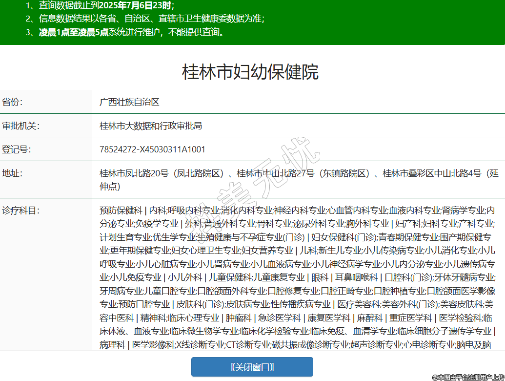 省份:廣西壯族自治區(qū)審批機關(guān):桂林市大數(shù)據(jù)和行政審批局登記號:78524272-X45030311A1001地址:桂林市鳳北路20號(鳳北路院區(qū))、桂林市中山北路27號(東鎮(zhèn)路院區(qū))、桂林市疊彩區(qū)中山北路4號(延伸點)診療科目:預防保健科 | 內(nèi)科;呼吸內(nèi)科專業(yè);消化內(nèi)科專業(yè);神經(jīng)內(nèi)科專業(yè);心血管內(nèi)科專業(yè);血液內(nèi)科專業(yè);腎病學專業(yè);內(nèi)分泌專業(yè);免疫學專業(yè) | 外科;普通外科專業(yè);骨科專業(yè);泌尿外科專業(yè);胸外科專業(yè) | 婦產(chǎn)科;婦科專業(yè);產(chǎn)科專業(yè);計劃生育專業(yè);優(yōu)生學專業(yè);生殖健康與不孕癥專業(yè)(門診) | 婦女保健科(門診);青春期保健專業(yè);圍產(chǎn)期保健專業(yè);更年期保健專業(yè);婦女心理衛(wèi)生專業(yè);婦女營養(yǎng)專業(yè) | 兒科;新生兒專業(yè);小兒傳染病專業(yè);小兒消化專業(yè);小兒呼吸專業(yè);小兒心臟病專業(yè);小兒腎病專業(yè);小兒血液病專業(yè);小兒神經(jīng)病學專業(yè);小兒內(nèi)分泌專業(yè);小兒遺傳病專業(yè);小兒免疫專業(yè) | 小兒外科 | 兒童保健科;兒童康復專業(yè) | 眼科 | 耳鼻咽喉科 | 口腔科(門診);牙體牙髓病專業(yè);牙周病專業(yè);兒童口腔專業(yè);口腔頜面外科專業(yè);口腔修復專業(yè);口腔正畸專業(yè);口腔種植專業(yè);口腔頜面醫(yī)學影像專業(yè);預防口腔專業(yè) | 皮膚科(門診);皮膚病專業(yè);性傳播疾病專業(yè) | 醫(yī)療美容科;美容外科(門診);美容皮膚科;美容中醫(yī)科 | 精神科;臨床心理專業(yè) | 腫瘤科 | 急診醫(yī)學科 | 康復醫(yī)學科 | 麻醉科 | 重癥醫(yī)學科 | 醫(yī)學檢驗科;臨床體液、血液專業(yè);臨床微生物學專業(yè);臨床化學檢驗專業(yè);臨床免疫、血清學專業(yè);臨床細胞分子遺傳學專業(yè) | 病理科 | 醫(yī)學影像科;X線診斷專業(yè);CT診斷專業(yè);磁共振成像診斷專業(yè);超聲診斷專業(yè);心電診斷專業(yè);腦電及腦血流圖診斷專業(yè);神經(jīng)肌肉電圖專業(yè);介入放射學專業(yè) | 中醫(yī)科;內(nèi)科專業(yè);婦產(chǎn)科專業(yè);兒科專業(yè);老年病科專業(yè)******級別:三級法定代表人:盧浩華主要負責人:盧浩華執(zhí)業(yè)許可證有效期:2015/07/06 -至- 2030/07/05 -