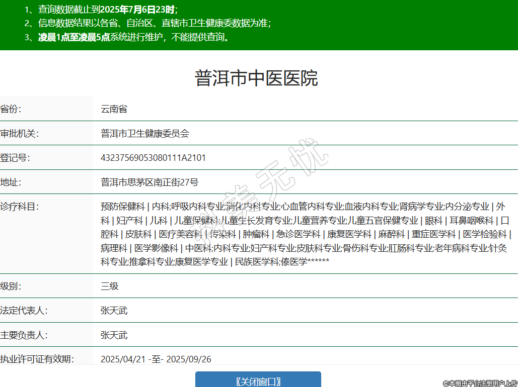 省份:云南省審批機(jī)關(guān):普洱市衛(wèi)生健康委員會(huì)登記號(hào):43237569053080111A2101地址:普洱市思茅區(qū)南正街27號(hào)診療科目:預(yù)防保健科 | 內(nèi)科;呼吸內(nèi)科專業(yè);消化內(nèi)科專業(yè);心血管內(nèi)科專業(yè);血液內(nèi)科專業(yè);腎病學(xué)專業(yè);內(nèi)分泌專業(yè) | 外科 | 婦產(chǎn)科 | 兒科 | 兒童保健科;兒童生長(zhǎng)發(fā)育專業(yè);兒童營(yíng)養(yǎng)專業(yè);兒童五官保健專業(yè) | 眼科 | 耳鼻咽喉科 | 口腔科 | 皮膚科 | 醫(yī)療美容科 | 傳染科 | 腫瘤科 | 急診醫(yī)學(xué)科 | 康復(fù)醫(yī)學(xué)科 | 麻醉科 | 重癥醫(yī)學(xué)科 | 醫(yī)學(xué)檢驗(yàn)科 | 病理科 | 醫(yī)學(xué)影像科 | 中醫(yī)科;內(nèi)科專業(yè);婦產(chǎn)科專業(yè);皮膚科專業(yè);骨傷科專業(yè);肛腸科專業(yè);老年病科專業(yè);針灸科專業(yè);推拿科專業(yè);康復(fù)醫(yī)學(xué)專業(yè) | 民族醫(yī)學(xué)科;傣醫(yī)學(xué)******級(jí)別:三級(jí)法定代表人:張?zhí)煳?/div>主要負(fù)責(zé)人:張?zhí)煳?/div>執(zhí)業(yè)許可證有效期:2025/04/21 -至- 2025/09/26
